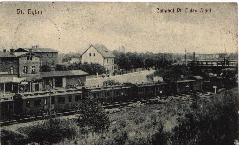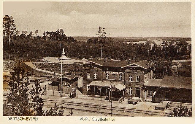 Na pierwszym planie ulica Stacyjna i jakaś wąskotorówka, po prawej budynek dworca PKP, a za nim wiadukt w ciągu ulicy Biskupskiej nad stacją Iława Miasto. Widok w kierunku Iławy Głównej, Działdowa i Warszawy.