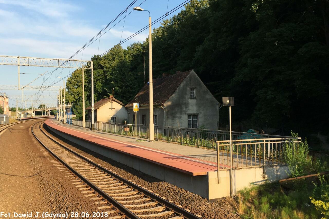 Widok na peron 1 na którym znajduje się wiata dla podróżnych. Budynek dworcowy znajduje się po lewej stronie. W lewo Prabuty i Malbork, w prawo Iława Główna.