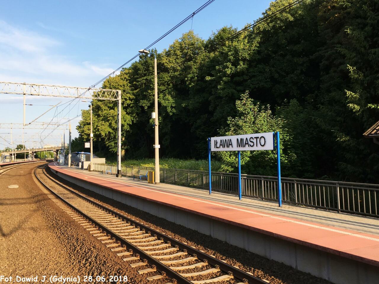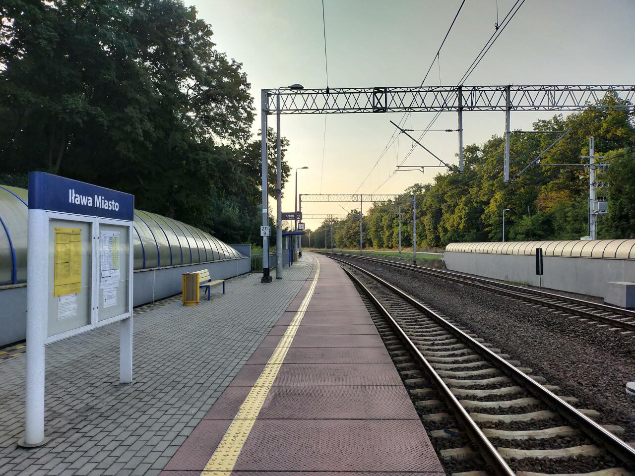 Budynek dworca PKP Iława Miasto. Po prawej peron, a w oddali wiadukt w ciągu ulicy Biskupskiej. Widok w kierunku Iławy Głównej, Działdowa i Warszawy.