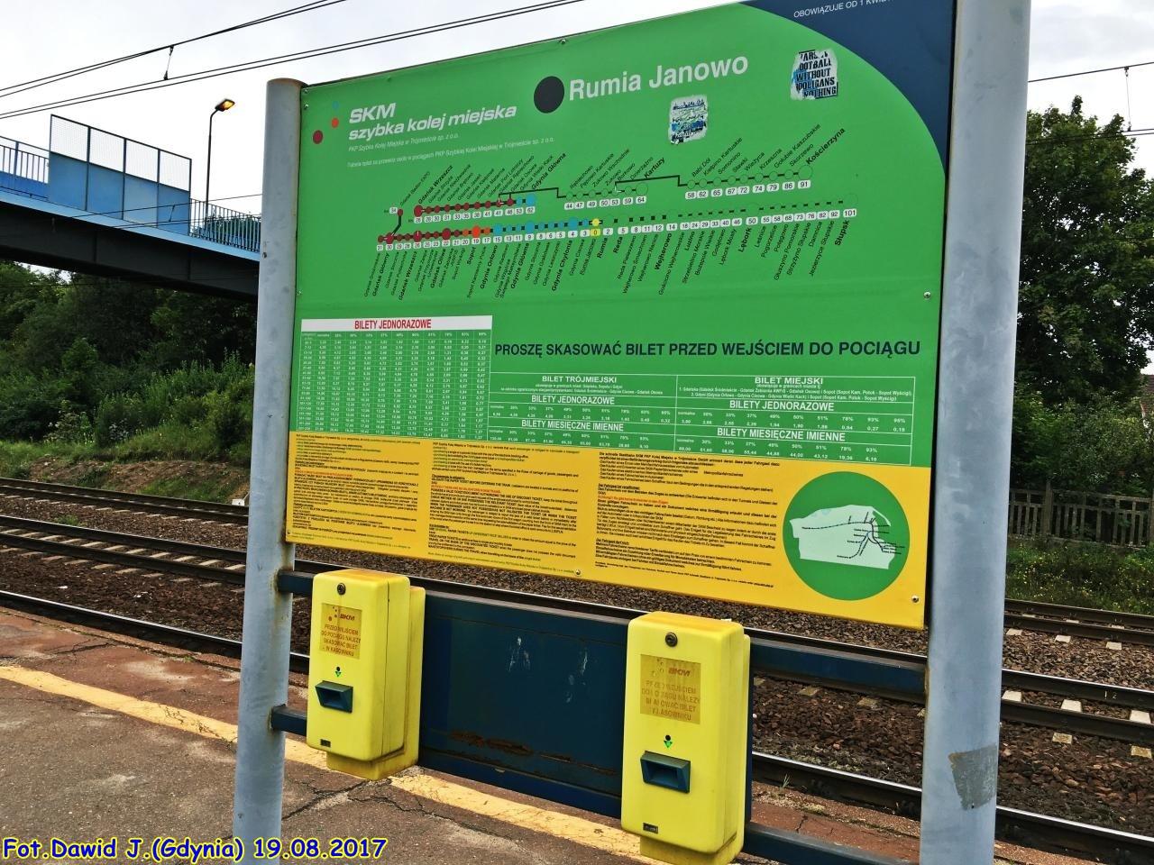 Opis ogólny: Stacja pełni rolę przystanku. Budynek dróżnika, w którym w latach 80 znajdowały się kasy biletowe został zburzony 17 - 18 maja 2005 (info: Robert Chrzanowski, 2005-05-21) Kasa nie jest czynna całą dobę. (info: Bartek Jaszczur, 2005-08-25) DANIEL NACZK.”Kolej w Rumi”.Rumia to ponad czterdziestotysięczne miasto położone na terenie Pradoliny Kaszubskiej w województwie pomorskim. Usytuowane przy trasie międzynarodowej (droga nr 6), łączącej Gdańsk ze Szczecinem, od wschodu graniczące z Gdynią, od zachodu z Redą. Dzisiejsze miasto skupia w swych granicach pięć dawnych osad wiejskich: Rumię, Zagórze, Białą Rzekę, Szmeltę, Janowo i kilka zapomnianych już dziś przysiółków. Istotne zmiany w życiu gospodarczym Rumi i Zagórza poczyniło włączenie obu wsi w obręb pruskiej sieci kolejowej. Dokonało się to za sprawą oddanej do użytku w latach 1869-1870 tzw. Kolei Pomorskiej z Koszalina do Gdańska, która wkrótce zapewniła kolejowe połączenie Gdańska ze Szczecinem. W dniu 16.10.1866 roku odbyło się zebranie właścicieli gruntów w Rumi, Ludwikowie, Białej Rzece i Krępcu, przez które to miała przebiegać linia kolejowa, poświęcone sprawie odszkodowań za wywłaszczone grunty. 24 kwietnia 1867 roku Towarzystwu Kolei Berlińsko – Szczecińskiej przyznano koncesję na budowę odcinka ze Słupska do Gdańska, a wiosną 1869 roku przystąpiono do pierwszych wywłaszczeń i wykupu gruntów. W czerwcu 1869 roku na terenie Rumi i Janowa przystąpiono do prac budowlanych, rozpoczynając je od Białej Rzeki i Zagórza, zgodnie z przebiegiem linii z zachodu na wschód. Rozbudowa infrastruktury kolejowej dotyczyła zarówno samego toru, jak i mostów oraz strażnic kolejowych (Bahnwärterhaus), zlokalizowanych wzdłuż toru. Tym ostatnim warto się bliżej przyjrzeć. W opracowaniu Krzysztofa Labuddy czytamy: „Powstawały one na skrzyżowaniach z drogami kołowymi lub też dodatkowo pomiędzy strażnicami przejazdowymi – wówczas pełniły rolę posterunków odstępowych lub też siedziby pracowników torowych, odpowiedzialnych za dany odcinek linii. Ujednolicony budynek strażnicy składał się z części służbowej, większej części mieszkalnej i części gospodarczej, w formie przybudówki mieszczącej chlew oraz ustęp”( K. Labudda, „Dzieje kolei w Rumi”, „Świat Kolei” 2004, nr 10, s.22-23.). Na obszarze obecnej Rumi wybudowano pięć tego rodzaju obiektów, do dziś zachowały się trzy budowle. Pierwszą jest strażnica nr 231 na terenie dawnego Ludwikowa, przy skrzyżowaniu z obecną ulicą Mazurską, kolejną o numerze 232 wybudowano w Białej Rzece (skrzyżowanie z ulicą Zbychowską), strażnica nr 233 mieści się w Zagórzu (ul. Towarowa 17, nr 234 w Janowie przy ulicy Sobieskiego, nr 235 w Krępcu (granica miasta Rumi i Gdyni – obecnie nie istnieją strażnice usytuowane niegdyś w Białej Rzece i Rumi-Janowie. Budynki te stanowią ciekawy przykład XIX-wiecznego budownictwa kolejowego, wznoszone z cegły ,otynkowane w późniejszych latach, nierzadko posiadały zdobnicze detale architektoniczne, których ślady można było dostrzec na zrujnowanym obiekcie w Janowie, tuż przy przystanku kolejowym. (Dnia 14.05.2005 roku obiekt rozebrany!). Drewniane zdobienie krawędzi dachowej odpowiadało gustom ówczesnej architektury, zarówno kolejowych budynków stacyjnych, jak i powszechnej manierze zdobienia domostw wiejskich, małomiasteczkowych. Niestety janowski zabytek nie podlegał ochronie konserwatorskiej i niszczał w zastraszającym tempie. Pozostałe trzy budynki dawnych strażnic służą obecnie jako domy mieszkalne. Oficjalne otwarcie kolei nastąpiło 1.09.1870 roku, jednakże na terenie dzisiejszej Rumi, w żadnej z dawnych wsi nie otworzono stacji kolejowej. Dopiero 10.12.1880 roku otwarto przystanek osobowy Rahmel (Rumia), na którym zatrzymywały się pociągi osobowe i pospieszne. Po roku 1891r. (dekretem Dyrekcji Królewskiej Kolei Wschodniej w Bydgoszczy) przystąpiono do prac projektowych nad zagospodarowaniem zagórskich terenów kolejowych. Na początku 1907 roku zmieniono plany i ruszyła budowa nowej stacji kolejowej, rozbudowa torów i placów ładunkowych, placu składowego drewna i rampy załadunkowej. W sąsiedztwie stacji wybudowano piętrowy budynek mieszkalny z czerwonej cegły przeznaczony dla pracowników kolei i zabudowania gospodarcze. Obiekt istnieje do dziś (ul. Towarowa13.) W bliskiej odległości znajdowała się również karczma. Oddana do użytku otrzymała nazwę Rahmel-Sagorsch (Rumia-Zagórze). Przedsiębiorstwo Ostdeutsche Kalkmergelwerke G.m.b.H z Gdańska z położonym w pobliżu stacji zakładem produkcyjnym, doprowadziło do poprowadzenia na teren fabryczny kolejki wąskotorowej. Zachował się budynek dawnego przedsiębiorstwa, dziś dom mieszkalny przy ulicy Morskiej. Ciekawy architektonicznie budynek stacji Rahmel-Sagorsch, którego budowa wiosną 1916 roku została zakończona, nie dotrwał do naszych czasów, wysadzili go Niemcy w dniu 12.03.1945 roku . Wiadukt drogowy w Janowie również uległ zniszczeniu. Obiekt ten zbudowano w 1908 roku, miał on konstrukcję ze zbrojnego betonu, wiadukt łukowy z jezdnią u góry. Projekt sięgający jeszcze 1869 roku (kładka dla pieszych) zrealizowała firma Grabower Cementstein-Fabrik „COMET” G.m.b.H. ze Szczecina za kwotę 7925 marek. W 1981 roku oddano do użytku kładkę dla pieszych nad przystankiem w Rumi-Janowie, którą wybudowano na miejscu dawnego wiaduktu drogowego, zachowały się dwa nasypy ziemne, na których usytuowany był dawny obiekt. W końcu 1934 roku Towarzystwo Budowy i Eksploatacji Mieszkań dla Pracowników Kolejowych wybudowało osiedle, składające się z 34 bliźniaczych domków wolnostojących, mieszczących po dwa mieszkania i posiadających użytkowe poddasze. Domy posiadały własne działki i wybudowane obok nich zabudowania gospodarcze. Osiedle zwane Osadą Kolejową zachował