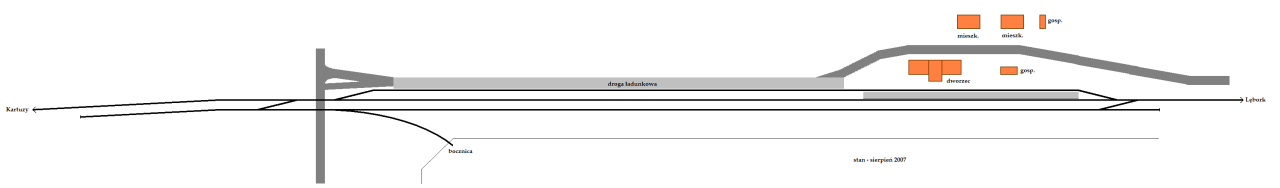 Opis ogólny: Z powodu zniszczenia linii brak dojazdu do stacji (2005) (info: Marcin Kulinicz, 2005-05-10) Miejsce to coraz mniej przypomina stację kolejową. (info: Bartek Jaszczur, 29-11-2008) Opis infrastruktury: Infrastruktura w dobrym stanie. Jeden jednokrawędziowy peron był wyłożony płytami chodnikowymi. Również i jednokrawędziowa wyładownia była pokryta płytami betonowymi. Na stacji znajdują się ręczne urządzenia SRK. (info: sajan, 2006-10-19) Niestety, peron (1 z 1 krawędzią) został rozebrany, podobnie jak w Rozłazinie. (info: Bartek Jaszczur, 29-11-2008) Opis budynków: Budynek dworcowy adaptowany na mieszkanie. W czasach świetności ten parterowy, kryty papą budynek ze spadzistym dachem mieścił: poczekalnie, kasę biletową, lampiarnię, magazyn oraz pomieszczenia dyżurnego ruchu. Ustęp znajdował się poza budynkiem był murowany, kryty dachówką. (info: sajan, 2006-10-19) Budynek dworca z zewnątrz wygląda dobrze, w środku lekka dewastacja. Na uwagę zasługuje natomiast wyremontowany i dobrze się prezentujący budynek mieszkalny obok stacji. (info: Bernard Piechota, 2008-02-11) Niewielka przestrzeń wokół budynku dworcowego ogrodzona płotem. (info: Bartek Jaszczur, 29-11-2008) |