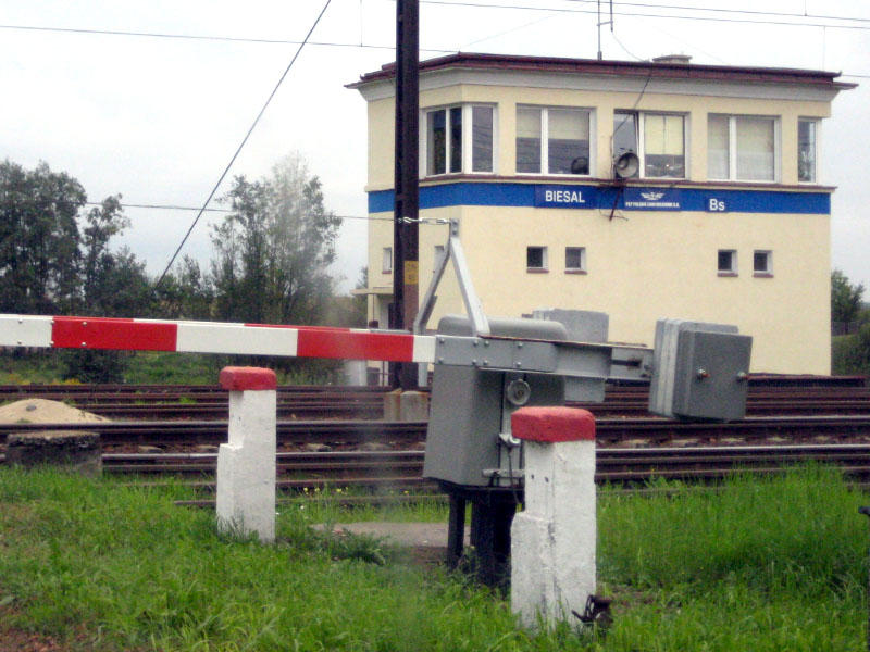 Stacja PKP Biesal. Nastawnia Bs przy przejeździe kolejowym na drodze Olsztynek - Podlejki. W lewo dworzec i perony, w prawo Olsztyn.