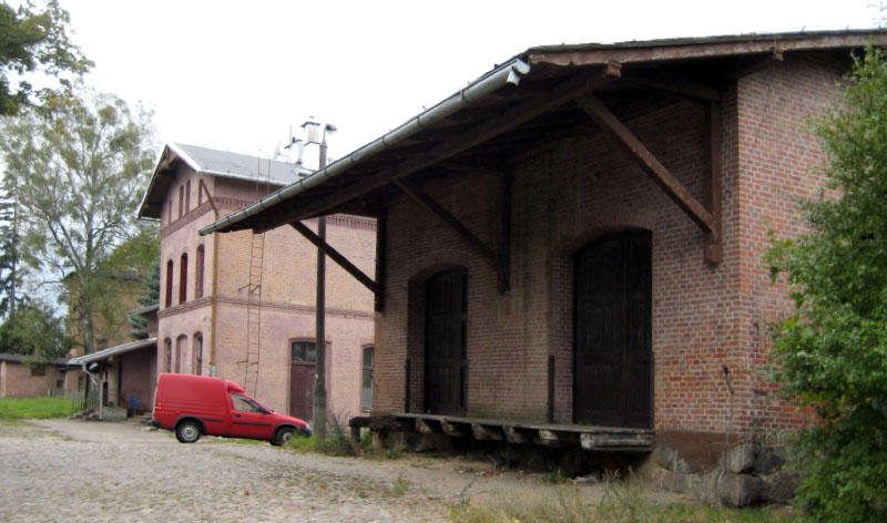 Budynek dworca od strony podjazdu. Z prawej fragment magazynu towarowego.