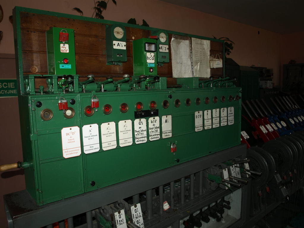 Nastawnia wykonawcza Bs1 od środka. Widoczne urządzenia sterowania ruchem: aparat blokowy i ława dźwigniowa. Obecnie urządzenia są już zdemontowane, a nastawnia nieczynna.