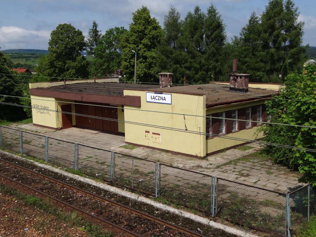 Widoczne semafory wjazdowe stacji Łączna od strony Skarżyska-Kamiennej. Po prawej dwa tory szlakowe, po lewej zelektryfikowany tor wyciągowy. Widok w kierunku Kielc. 159,4 km.