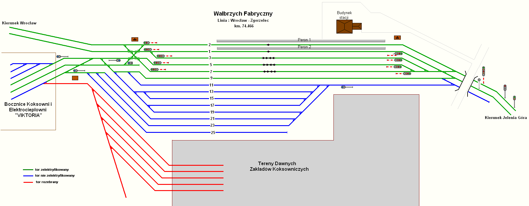 Opis ogólny: Niegdyś końcowa stacja linii z Wrocławia. Obecnie duża stacja towarowa i niewielka stacyjka pasażerska w strasznych krzakach ;) Widoczne na zdjęciach zabudowania fabryczne, wraz z dwiema potężnymi stalowymi wieżami wydobywczymi to dawny kompleks kopalni i koksowni "Bolesław Chrobry", zlikwidowany pod koniec XX wieku. Z wielu obiektów pozostały tylko nieliczne, w tym piękne wieże, które cudem uratowano przed złomowaniem, a które stanowią jeden z symboli Wałbrzycha. Obecnie głównym chlebodawcą stacji jest ostatnia działająca w mieście koksownia "Victoria' która koleją przyjmuje materiały do produkcji oraz wysyła gotowe produkty. Z racji tego pociągi są tu często okradane z przewożonego w nich towaru. Wałbrzych Fabryczny jest dworcem położonym bardzo blisko centrum miasta ale paradoksalnie jest on najsłabiej wykorzystywany, zwłaszcza po likwidacji kopalni i koksowni. (info: wasiukibic, 04-04-2009) Opis infrastruktury: Potężny kompleks przemysłowy miał niegdyś na swoim terenie rozbudowany układ torowy, dziś jest on w większości rozebrany. Od stacji w kierunku południowo-zachodnim odchodzi bocznica do koksowni "Victoria" (dawniej była tam jeszcze kopalnia i elektrociepłownia o tej samej nazwie). Dawniej tor boczny wychodził także ze stacji w kierunku wschodnim, na teren składowiska ale obecnie próżno szukać jakiegokolwiek śladu po nim w terenie. (info: wasiukibic, 04-04-2009) Po wiacie zostały jedyne dziury w bruku peronu w miejscu dawnych słupów. Grupa torów koksowni Victoria została ogrodzona płotem, na który nawinięty jest drut kolczasty. Pod torami szlakowymi w kierunku Wałbrzycha Miasto przebiega bocznica kolejowa w kierunku składu złomu, która to jest pozostałością po odcinku w kierunku Wałbrzycha Towarowego. (info: wasiukibic, 18-11-2009) |