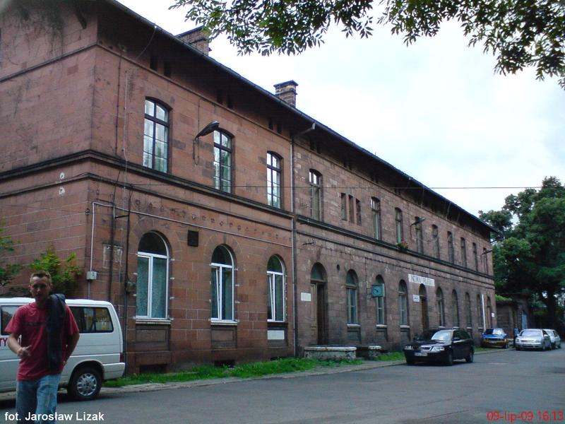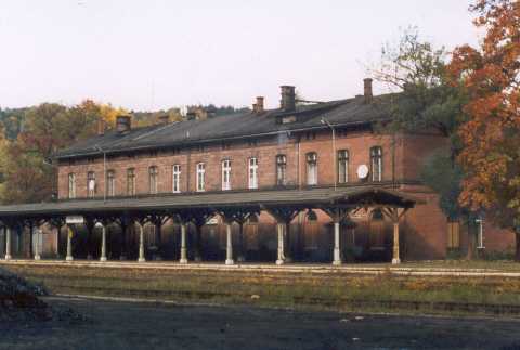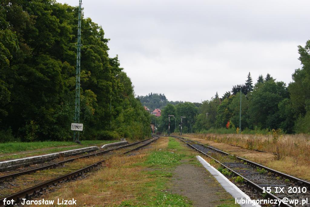 Głowica stacji od strony Jedliny-Zdrój/Wałbrzycha (na wprost). W tle nastawnia dysponująca NR i wiadukt kolejowy nad ul. Armii Krajowej. Widok w kierunku północno-wschodnim. Ze zbiorów Adama Pacześniaka.