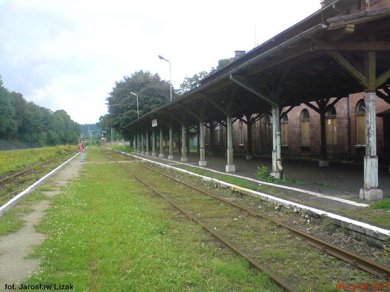 Widok na perony i budynek dworca w kierunku północno-zachodnim; w lewo Ścinawka Średnia/Kłodzko, w prawo Jedlina-Zdrój/Wałbrzych.