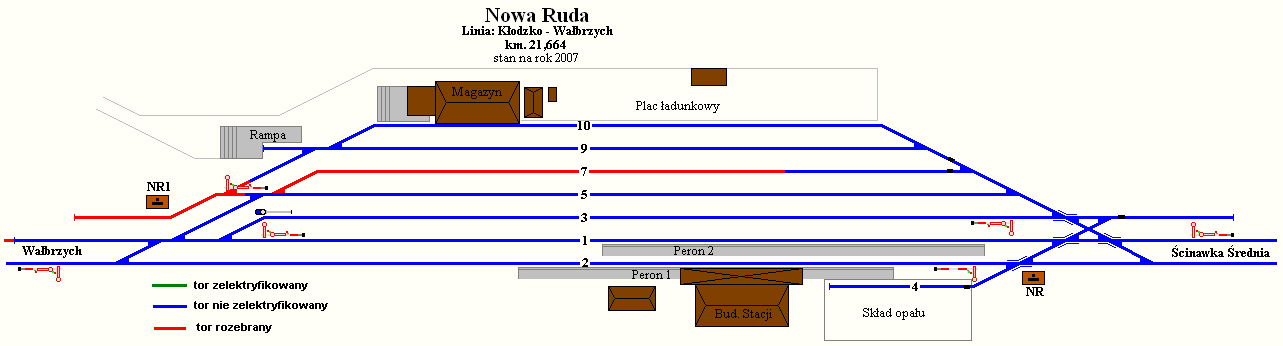 1 tor dodatkowy jest czynny i używany gdy perony/peron są zajęte. Ostatni przejechała tam samotna lokomotywa spalinowa (dla ruchu towarowego) gdyż obecnie stacja w Nowej Rudzie jest taką mijanką, przez modernizacje torowiska od Nowej Rudy, do Ścinawki Średniej.