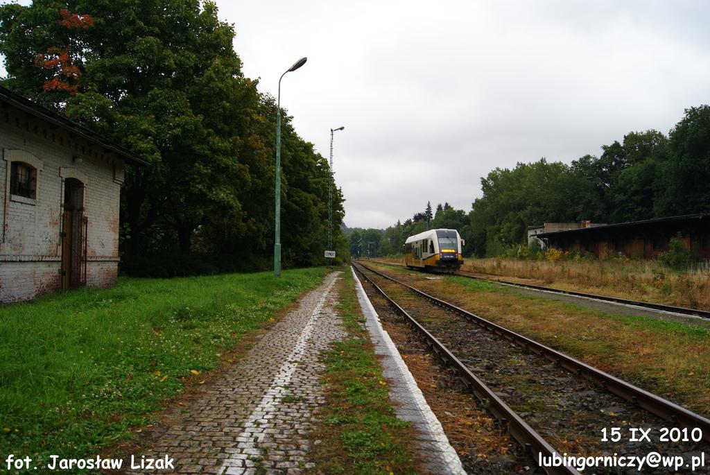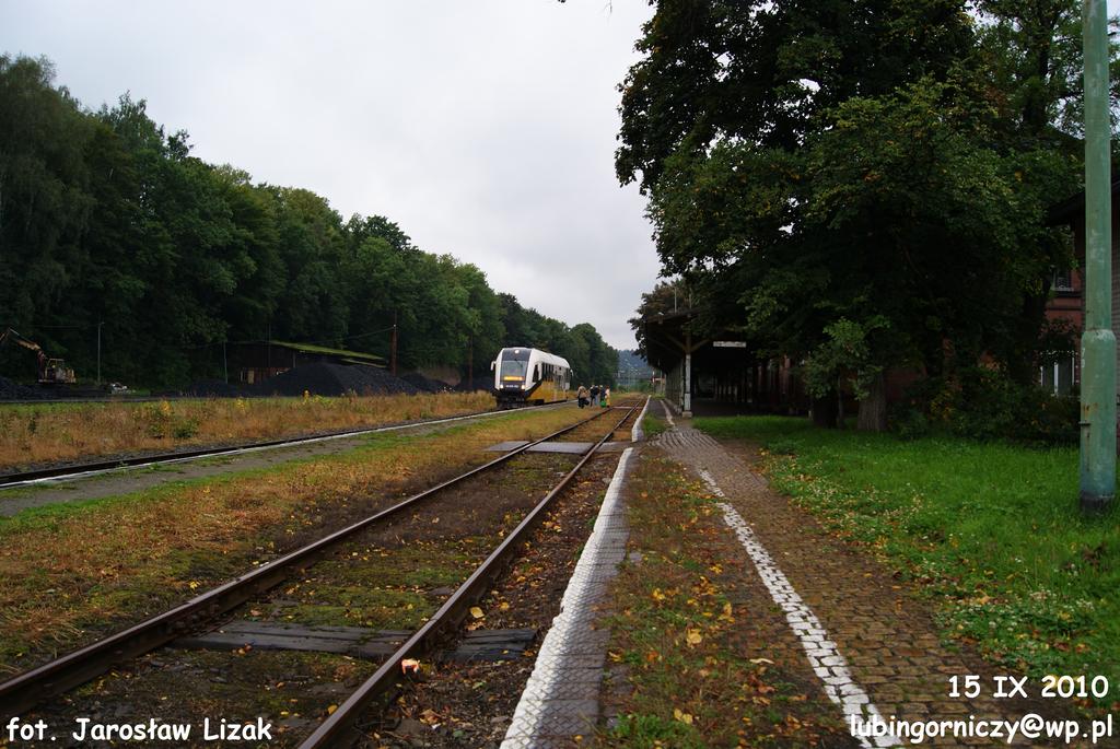 Nowa Ruda, szynobus Kolei Dolnośląskich relacji Kłodzko Miasto - Wałbrzych Gł. opuszcza noworudzką stację. Widok w kierunku wschodnim: Jedlina-Zdrój/Wałbrzych Główny.