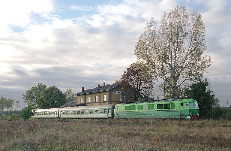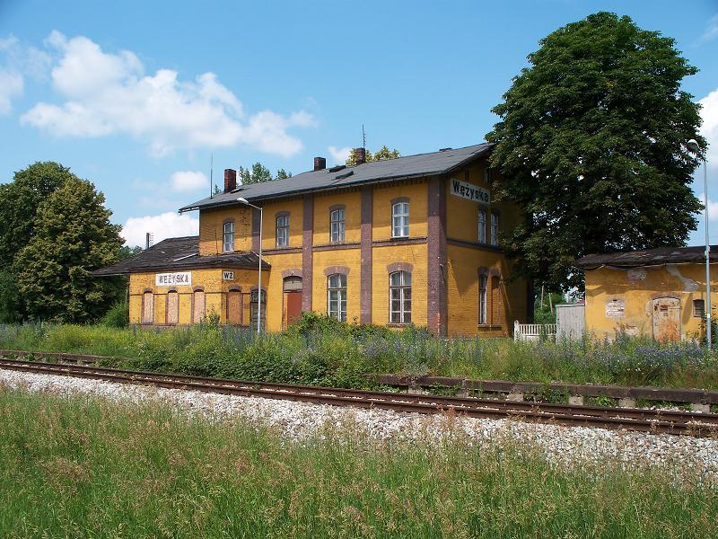 Popadający w ruinę, opuszczony budynek dworca w Wężyskach. Z prawej przylegał do niego magazyn towarowy, obecnie wyburzony. Widok od strony podjazdu w kierunku południowym.