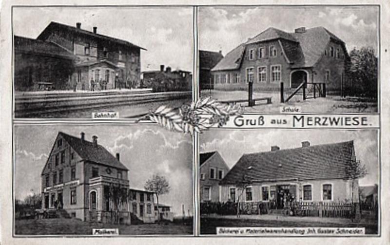 Pocztówka z widokami Merzwiese - m.in. dworzec z pociągiem. Widok od strony Starego Raduszca/Czerwieńska.