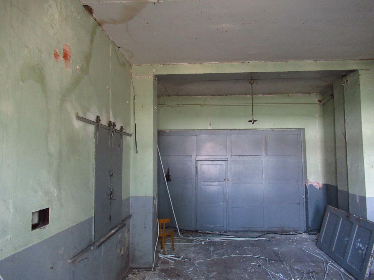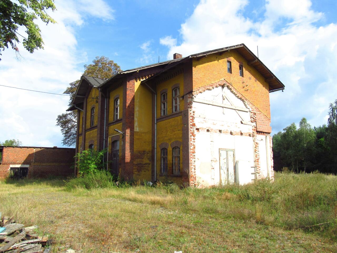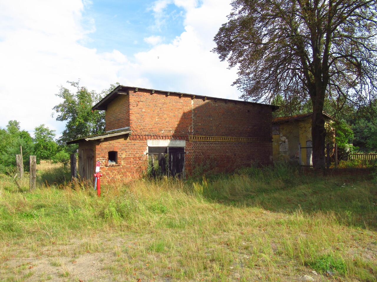 Opuszczony budynek gospodarczy stojący przy opuszczonym budynku dworca (z prawej, poza kadrem). Widok od strony podjazdu, w kierunku wschodnim.