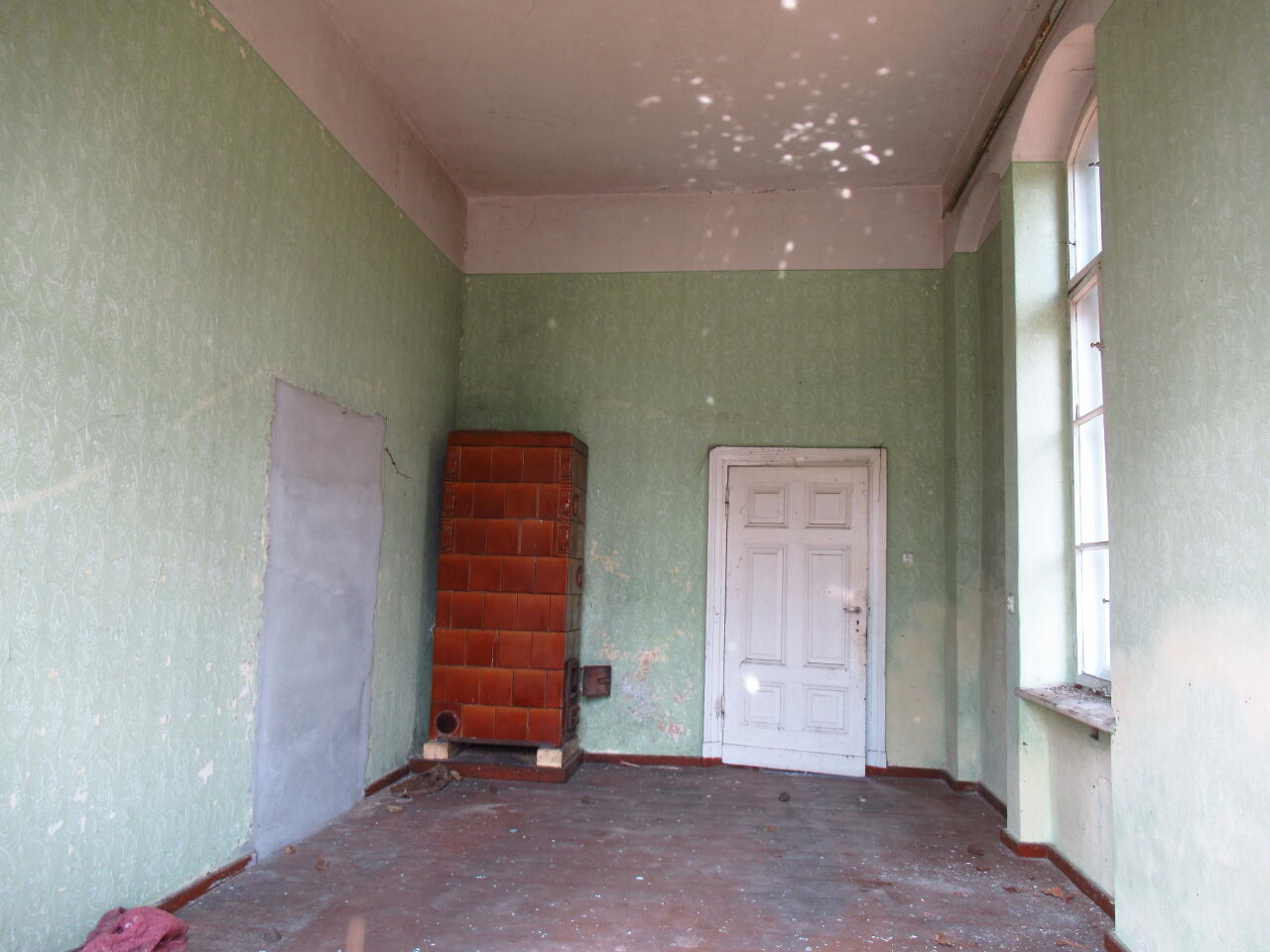 Wnętrze opuszczone dworca w Wężyskach, prawdopodobnie pomieszczenie mieszkalne.