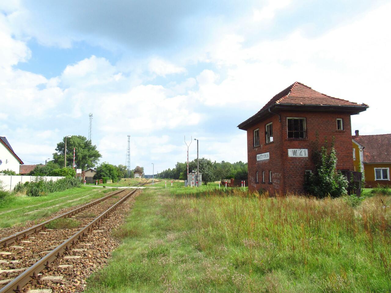 Aktualny widok budynku na stacji w Wężyskach. W prawo Stary Raduszec/Czerwieńsk, w lewo Gubin/Guben.