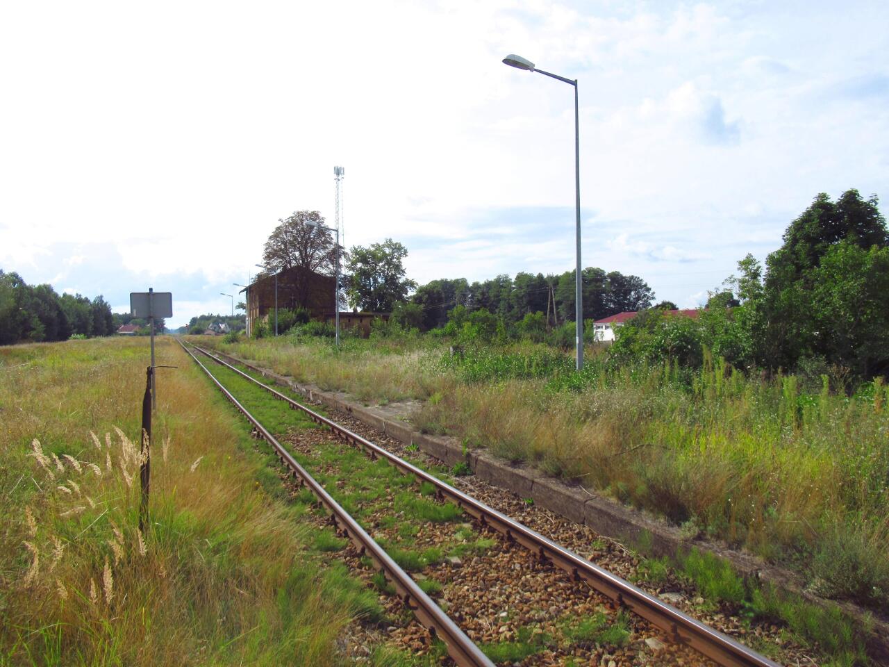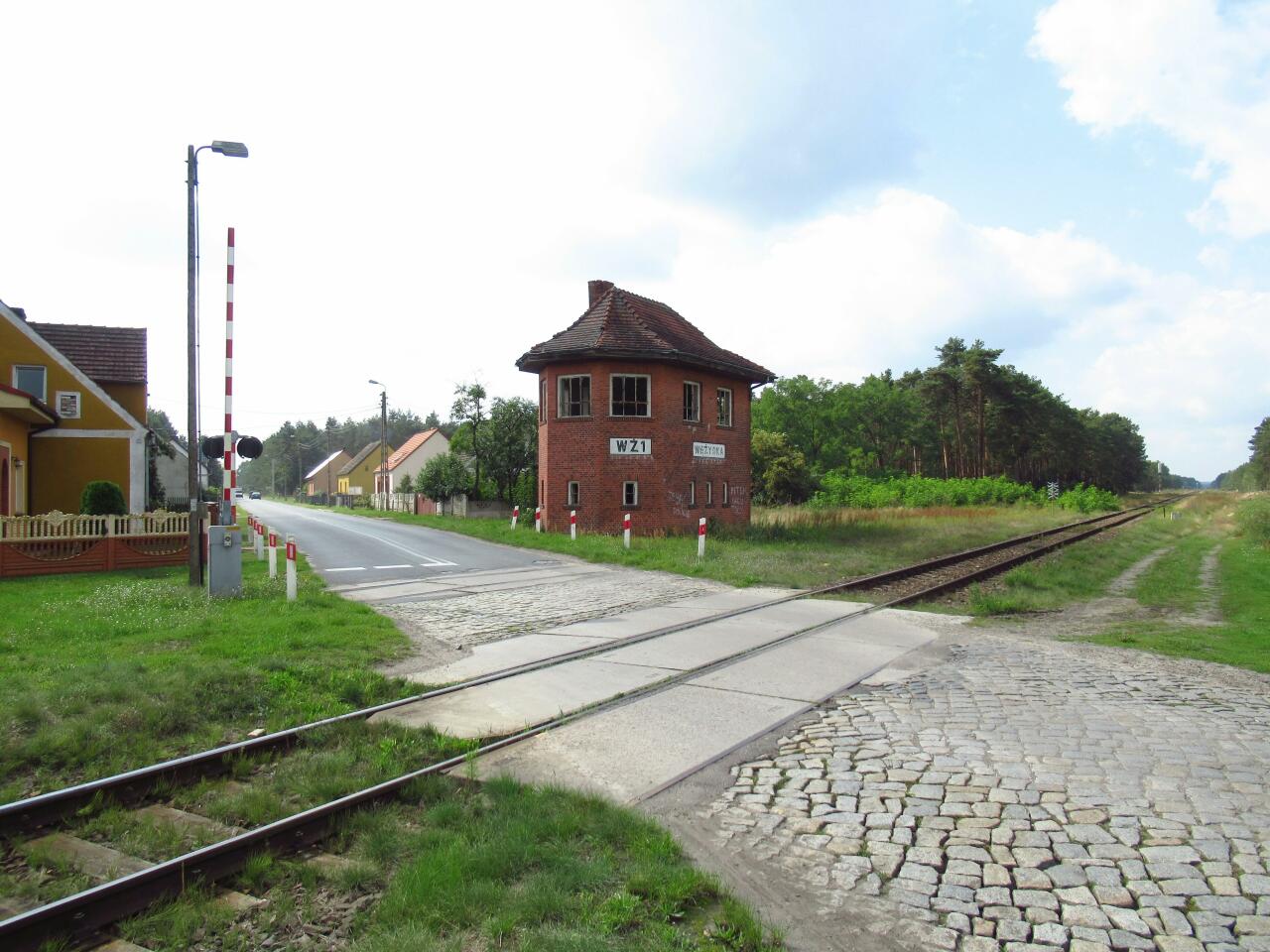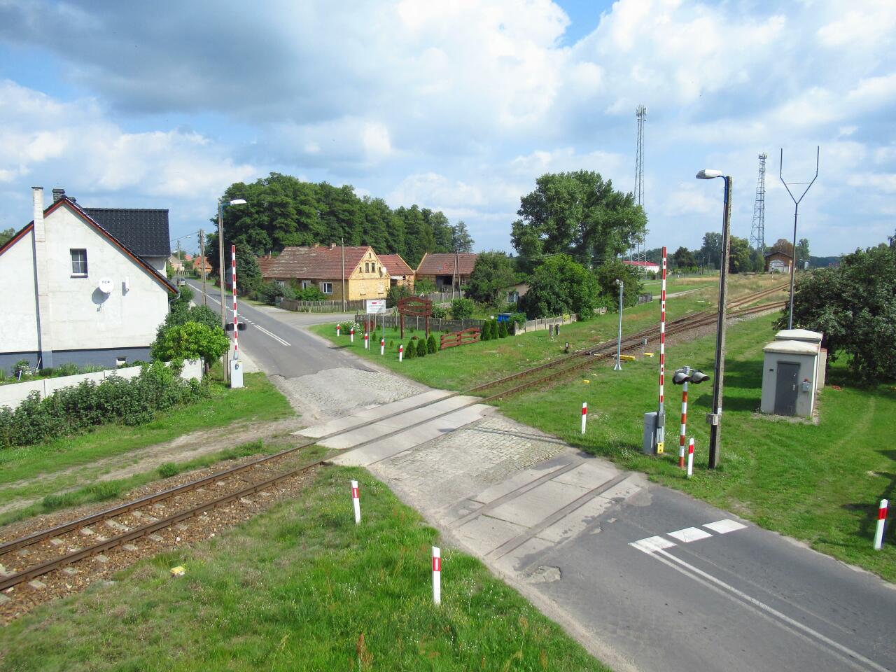 Przejazd kolejowy w zachodniej części dawnej stacji. W nawierzchni pozostałość pierwotnego przebiegu drugiego toru; wpierw szlakowego, później głównego, dodatkowego. Za przejazdem zdewastowana, nieczynna od ponad 20 lat nastawnia wykonawcza. Widok w kierunku południowo-zachodnim (Gubin/Guben).