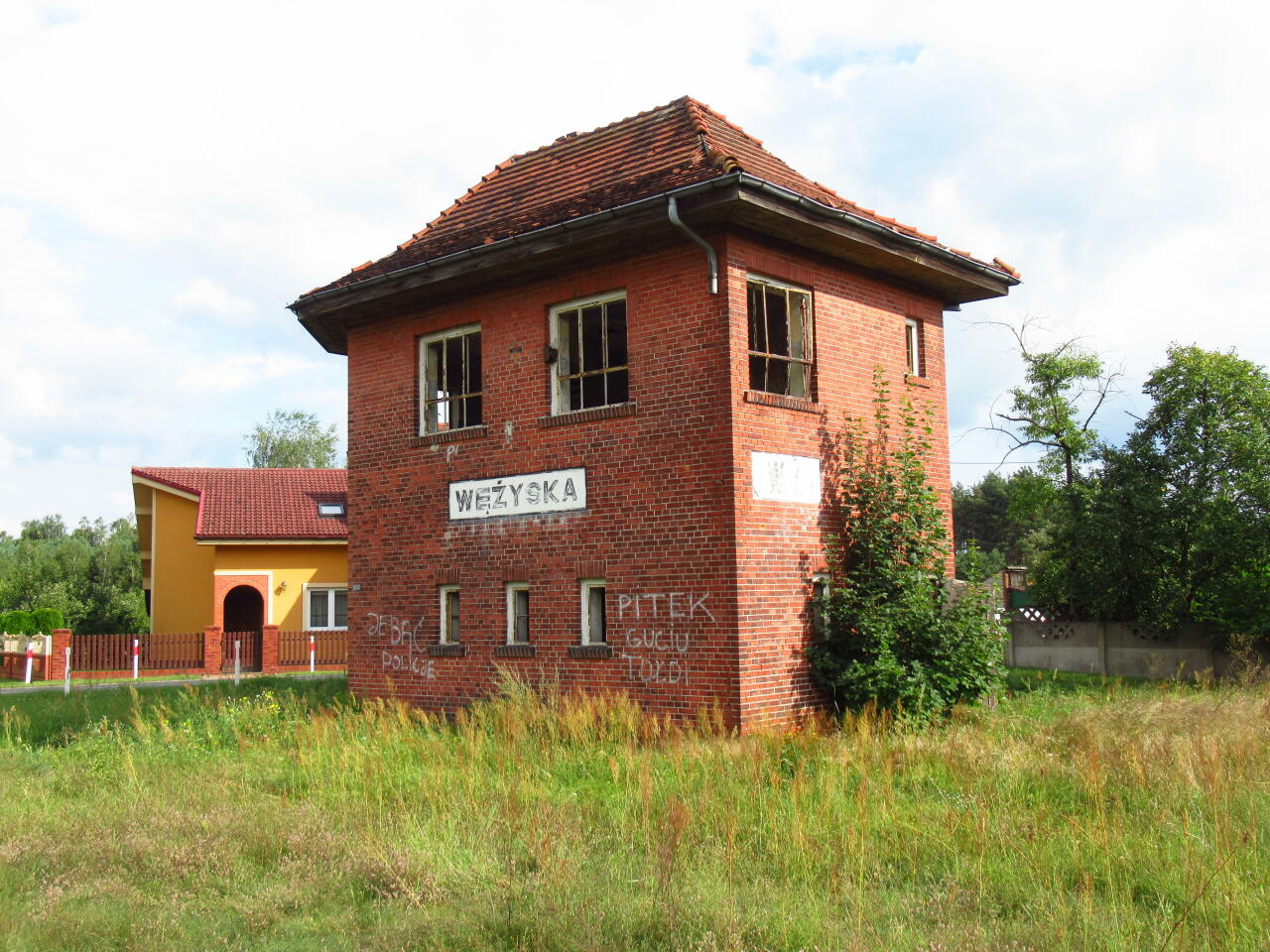 Popadające w ruinę, opuszczone budynki stacyjne w Wężyskach. Z tyłu dworzec, na froncie budynek gospodarczy. Do dworca przylegał magazyn towarowy i nastawnia dysponujące - oba obiekty wyburzone. Widok w kierunku północno-zachodnim; w prawo Stary Raduszec/Czerwieńsk, w lewo Gubin/Guben.