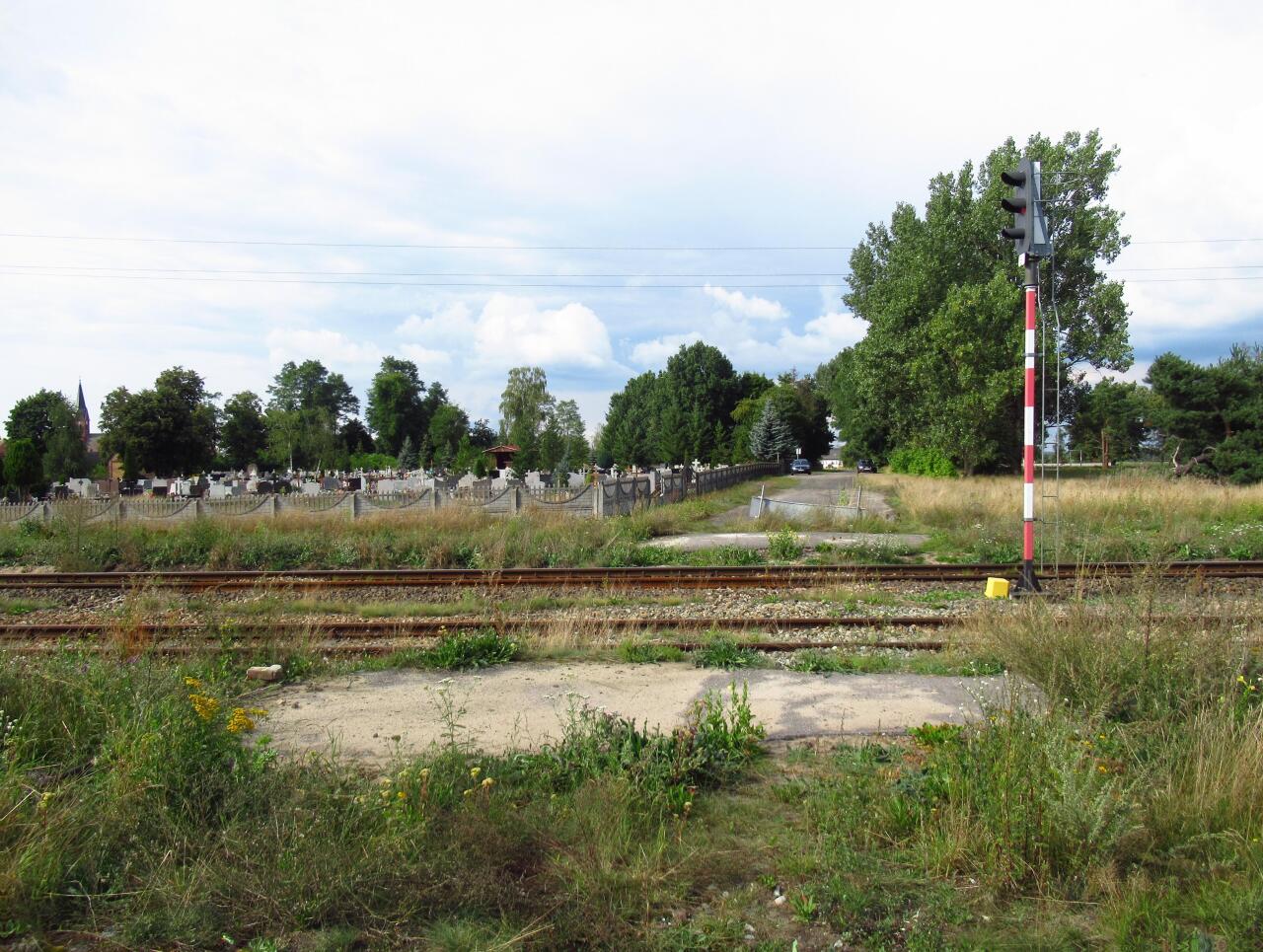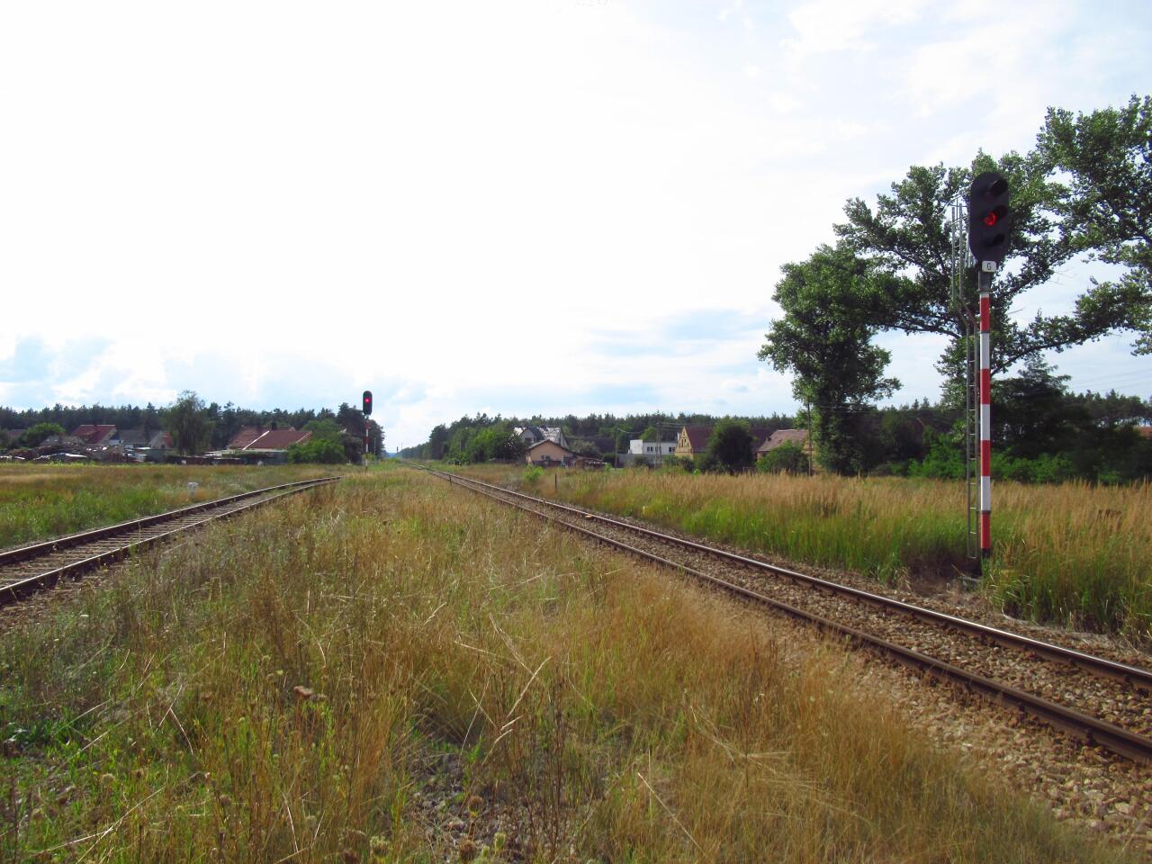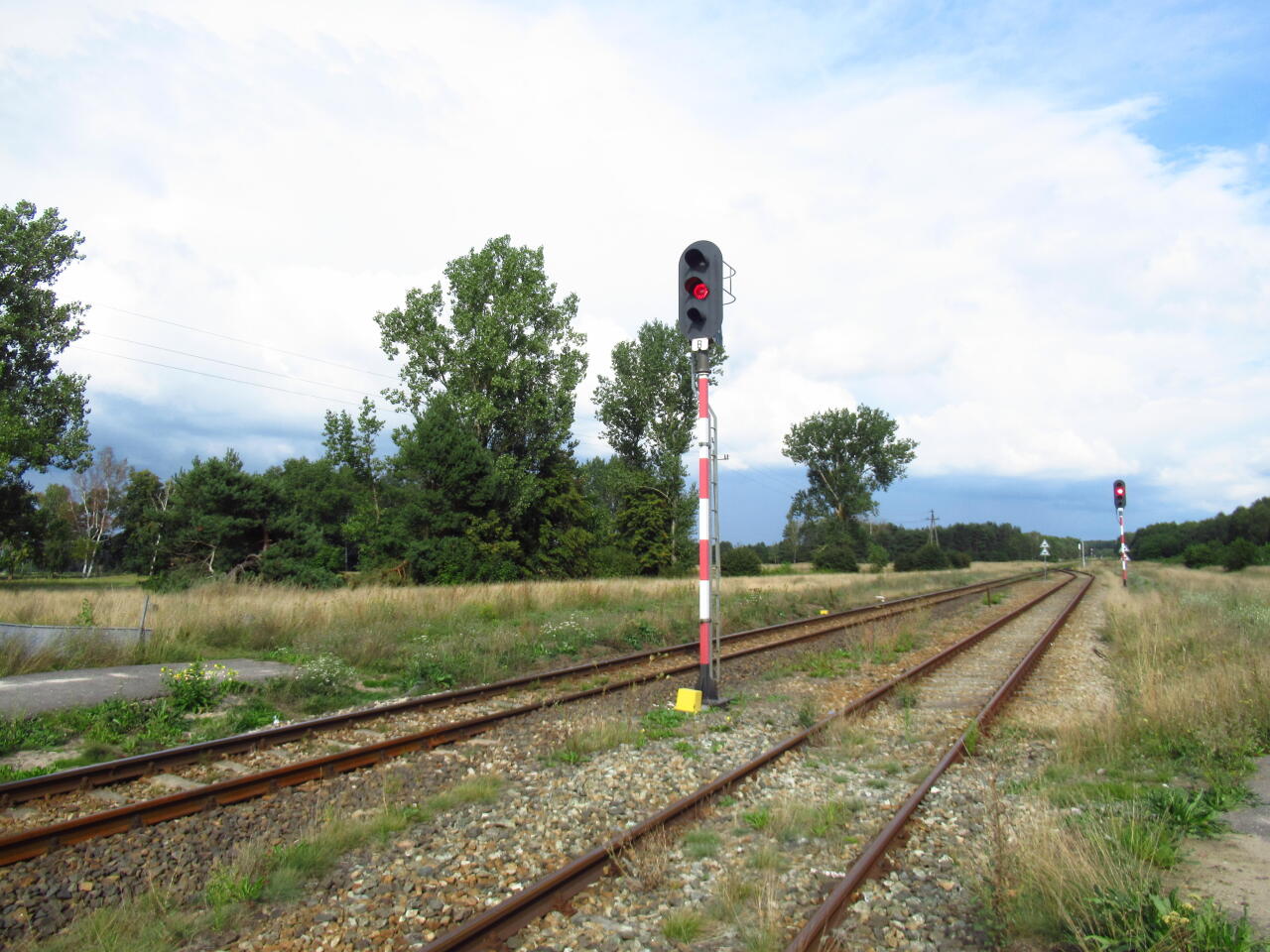 Semafory wyjazdowe w kierunku zachodnim (Guben). W tle przejazd kolejowym z nieczynna, zdewastowaną nastawnią.