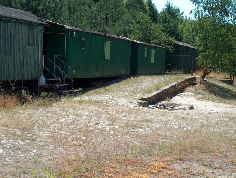 Wagony socjalne dawnej kolonii kolejowej ustawione pod rampą przy jednym z torów dawnej stacji w Prądówce. Tor główny znajduje się pomiędzy drzewami w tle…