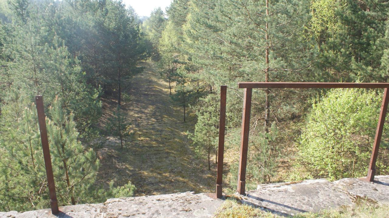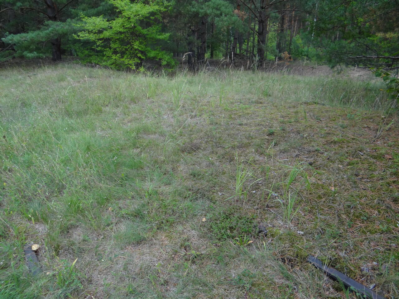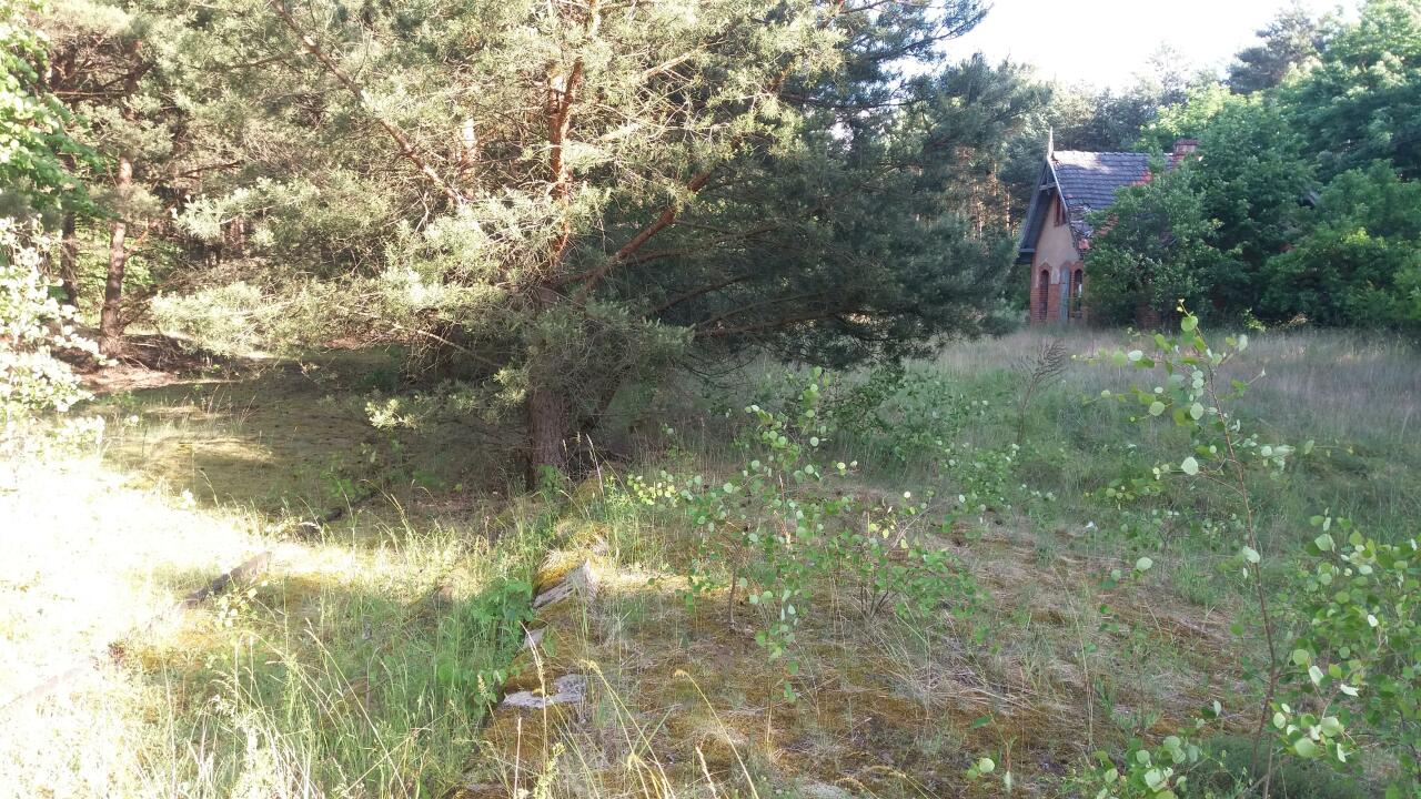 Dawny plac załadunkowy ładowni drewna w Prądówce. W krzakach widoczny skrajnik. W tle, za bramą, rampa kolejowa oraz funkcjonująca do dzisiaj kolonia kolejowa. Widok w kierunku Przychodzka (kierunek: Zbąszyń).