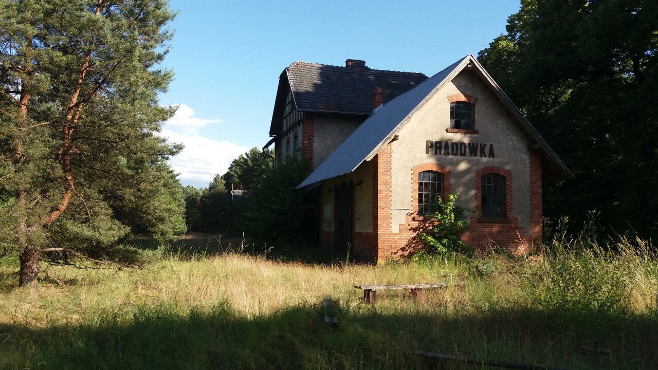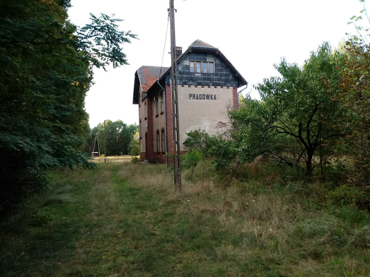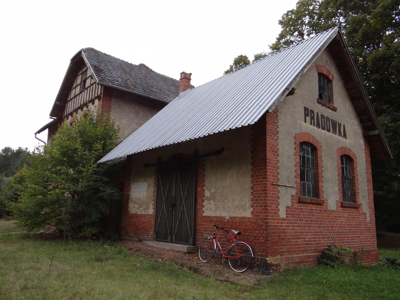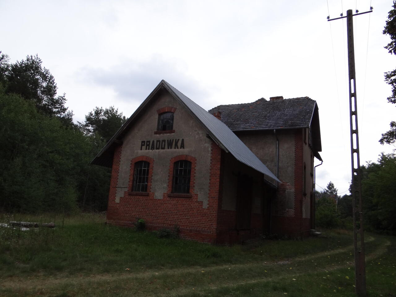 Magazyn, który jest częścią budynku dworcowego w Prądówce. W tle skąpa zabudowa wsi. Trzy budynki w środku lasu. I tutaj kursowały pociągi osobowe…