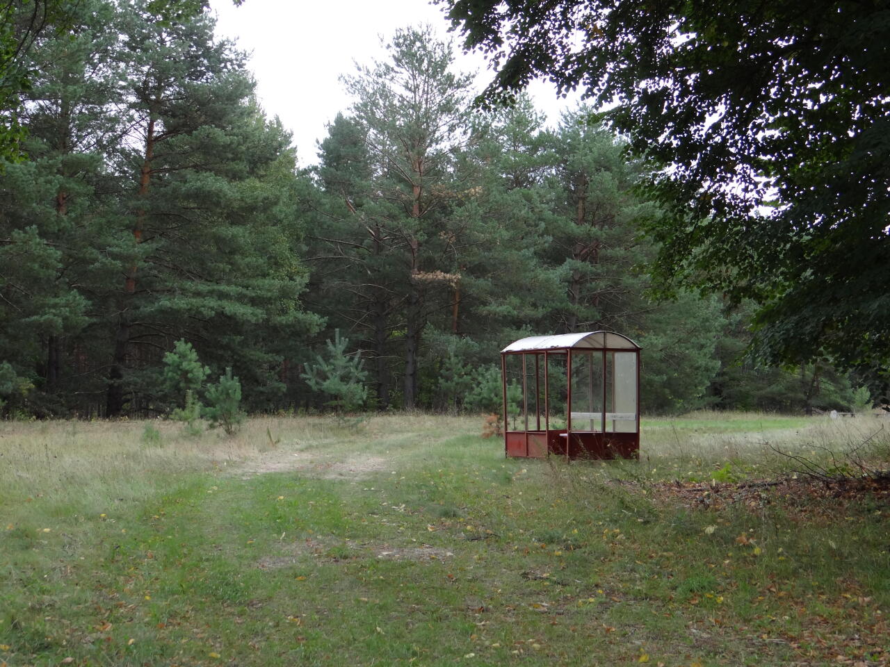 Na placu dworcowym przed stacją kolejową w Prądówce nieprzerwanie od piętnastu lat stoi wiata przystankowa. Jest to wiata autobusowa, chociaż nic tutaj nie jeździ. Stan wiaty nie zmienił się szczególnie od 2008 roku, kiedy fotografowałem ją ostatni raz. Torowisko kolejowe i peron ziemny znajdują się w tle, pod drzewami.