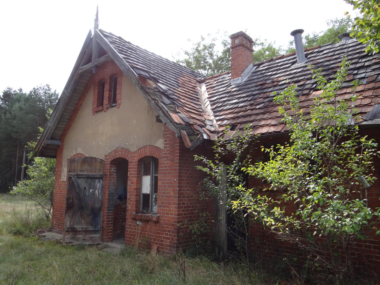 Widok na elewację budynku dworcowego od strony torów kolejowych. Z racji na lokalizację w środku lasu, z dala od cywilizacji, budynek, pomimo wielu lat od zamknięcia, wciąż prezentuje zadowalający stan.