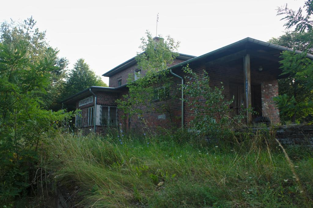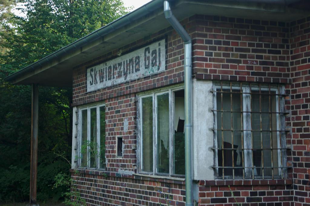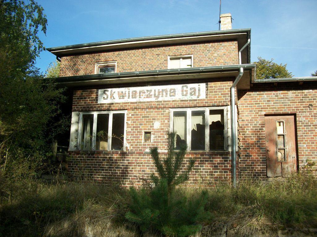 Skwierzyna Gaj. Zdjęcie przedstawia obraz nędzy i rozpaczy. Zapuszczony piękny budynek i otoczenie. Widok od strony nieistniejących torów, na których znalazłem m.in.… telewizor. W stronę Skwierzyny zachowały się fragmenty szyn, w stronę Murzynowa tylko krzaki. Cóż za cudowny przykład funkcjonalizmu. Na całej trasie budynki stacyjne i mieszkalne są perełkami na skalę Polski i nie tylko.