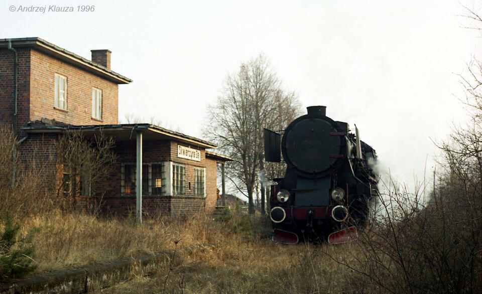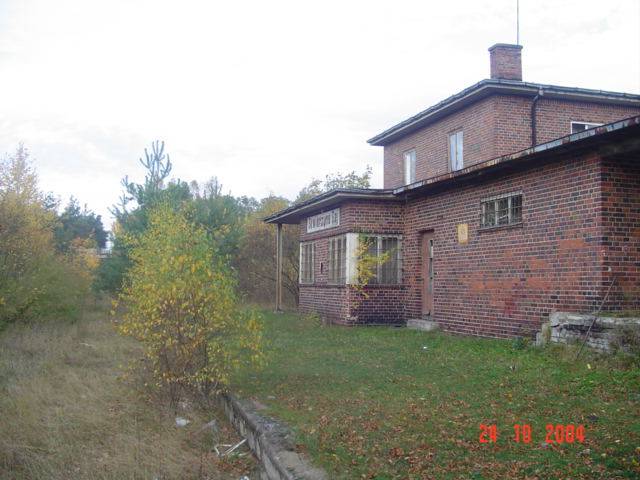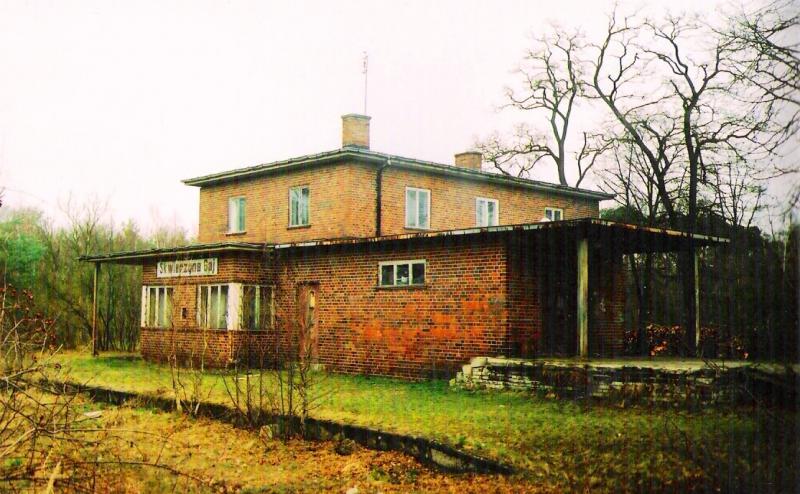 Stacja Skwierzyna Gaj. Na stacji mieszkał jeszcze kolejarz Pan Białkowski jako były zawiadowca, który jeszcze kilka lat obsługiwał ładownię położona po drugiej stronie torów, niż budynek stacyjny.