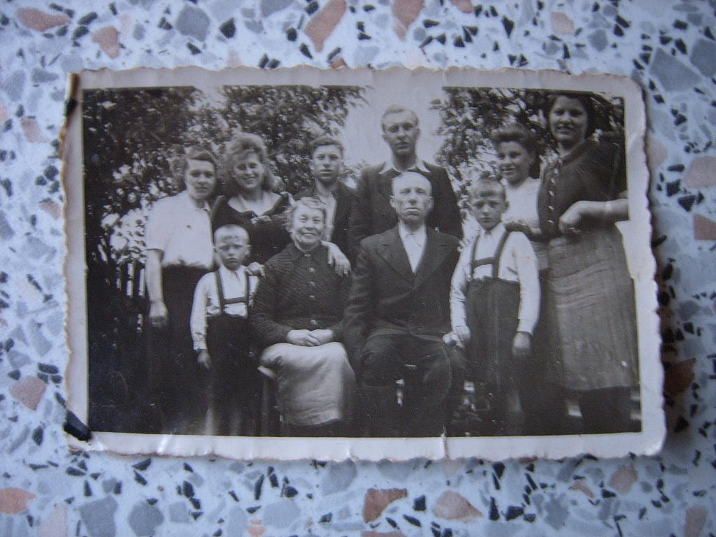 Torowy Józef Błoński z Rodziną na terenie posesji kolejowej pod dwoma topolami (dziś nie istniejąca, topole rosną w Dalanówku nadal).