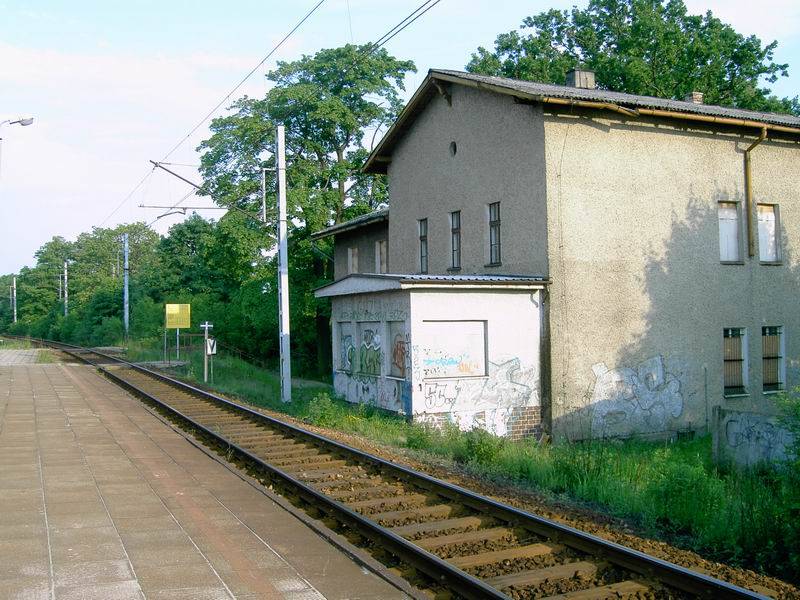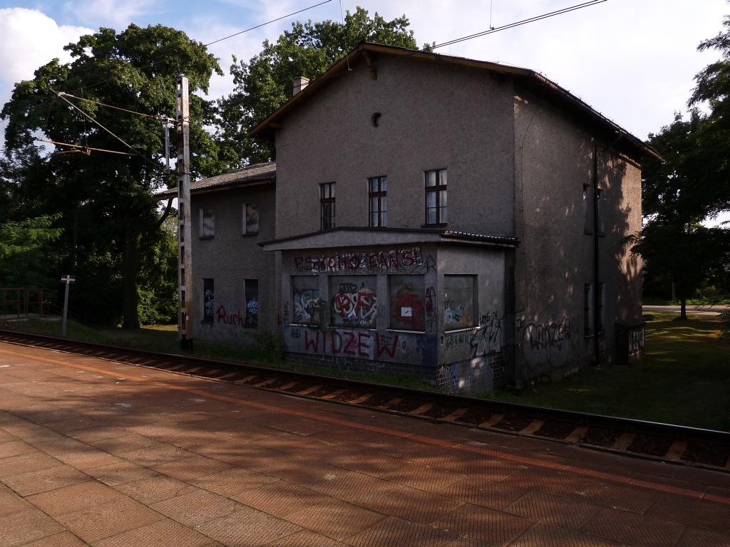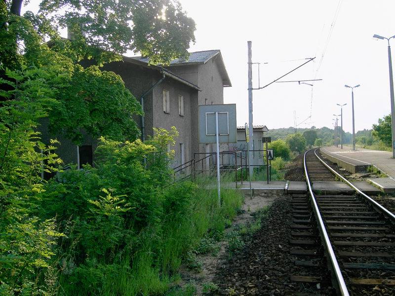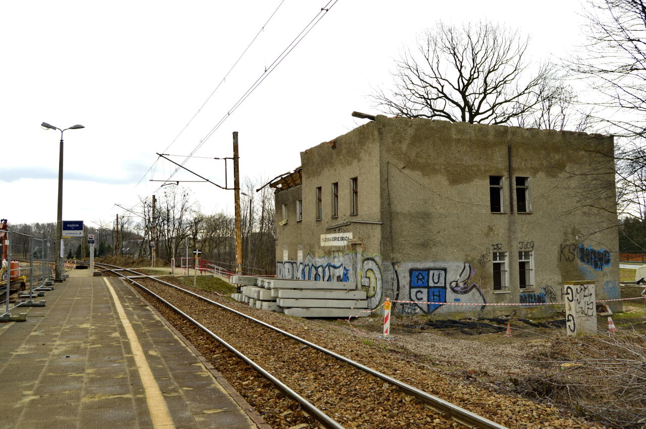 Łaziska Górne Brada, widok z peronu w kierunku Katowic. Po prawej dawny budynek dworca który poddawany jest rozbiórce.