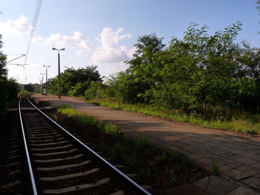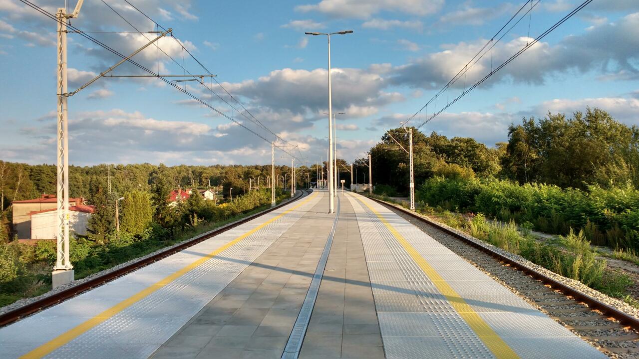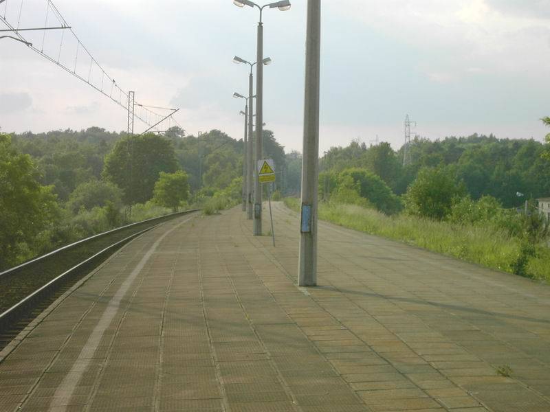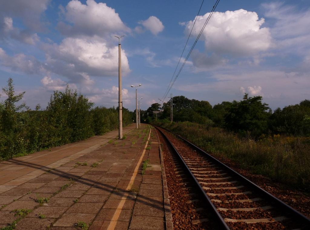 Odbudowana mijanka. Nowy peron już gotowy, widok z początku peronu w kierunku Orzesza, Rybnika. Tor po lewej, główny, przejezdny od czasu ukończenia remontu torowiska, tor po prawej, dodatkowy (odbudowany), jeszcze wyłączony z ruchu.