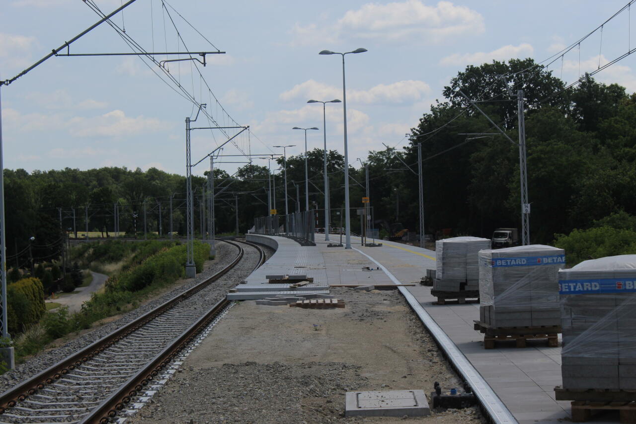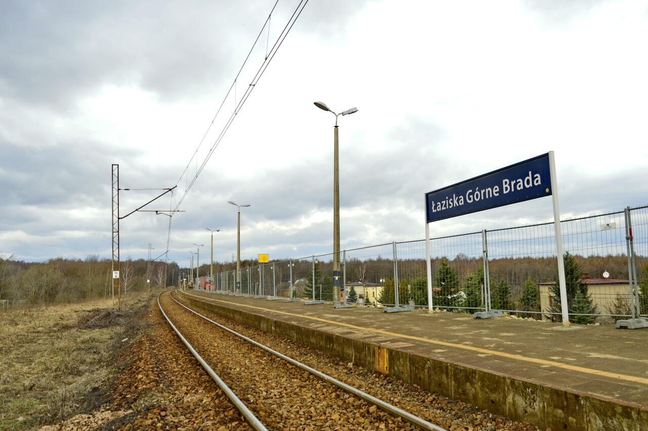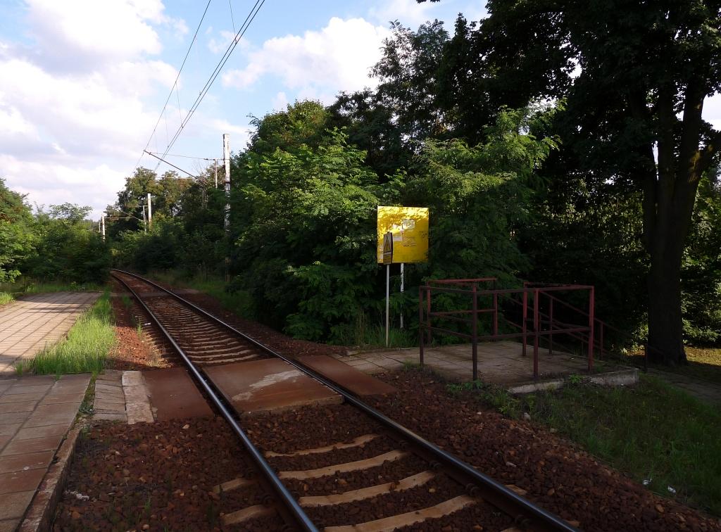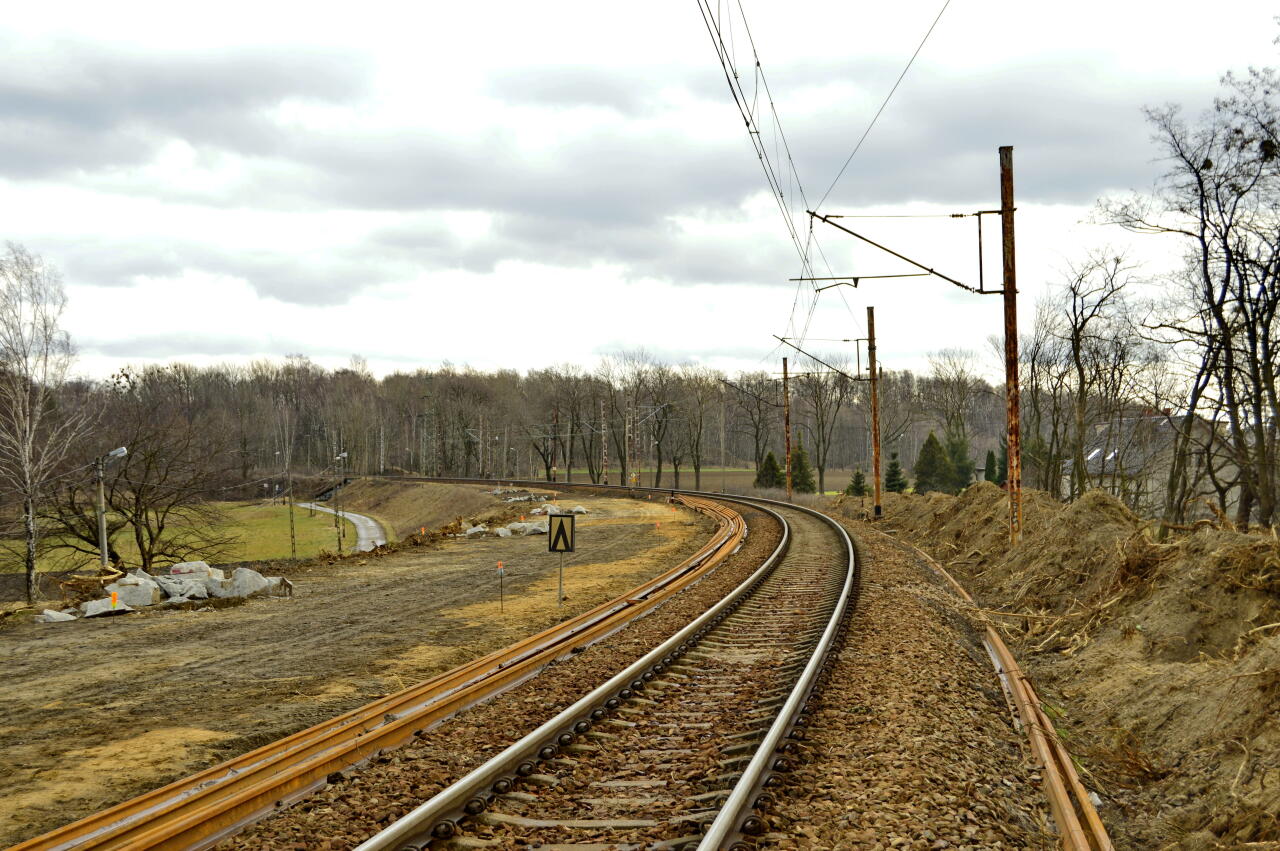Łaziska Górne Brada, widok w kierunku Katowic. Po lewej przygotowanie terenu pod odbudowę toru.