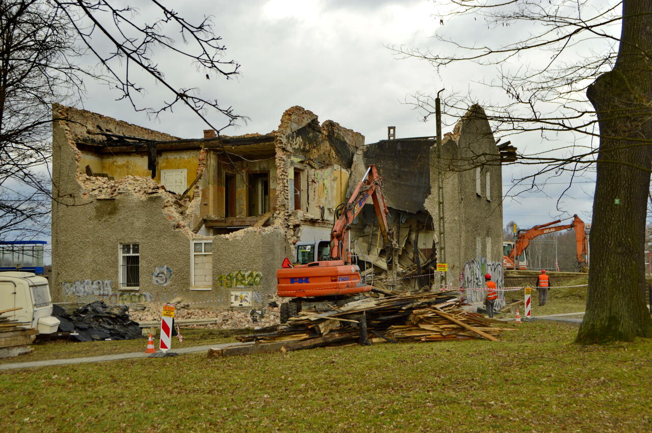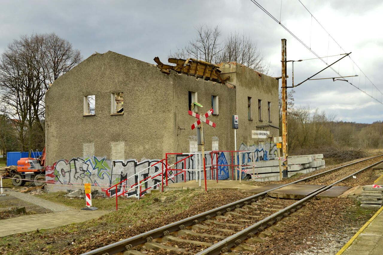 Łaziska Górne Brada, burzenie budynku dawnego dworca. Widok od strony peronu.