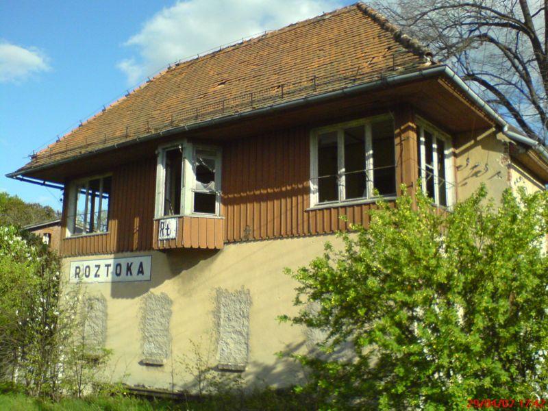 Wjazd na stację Roztoka od strony Bolkowa/Marciszowa. Z prawej nieczynna nastawnia dysponująca Rt. Na pierwszym planie fragment przejazdu kolejowego przez ul. 3 maja. Widok w kierunku wschodnim.
