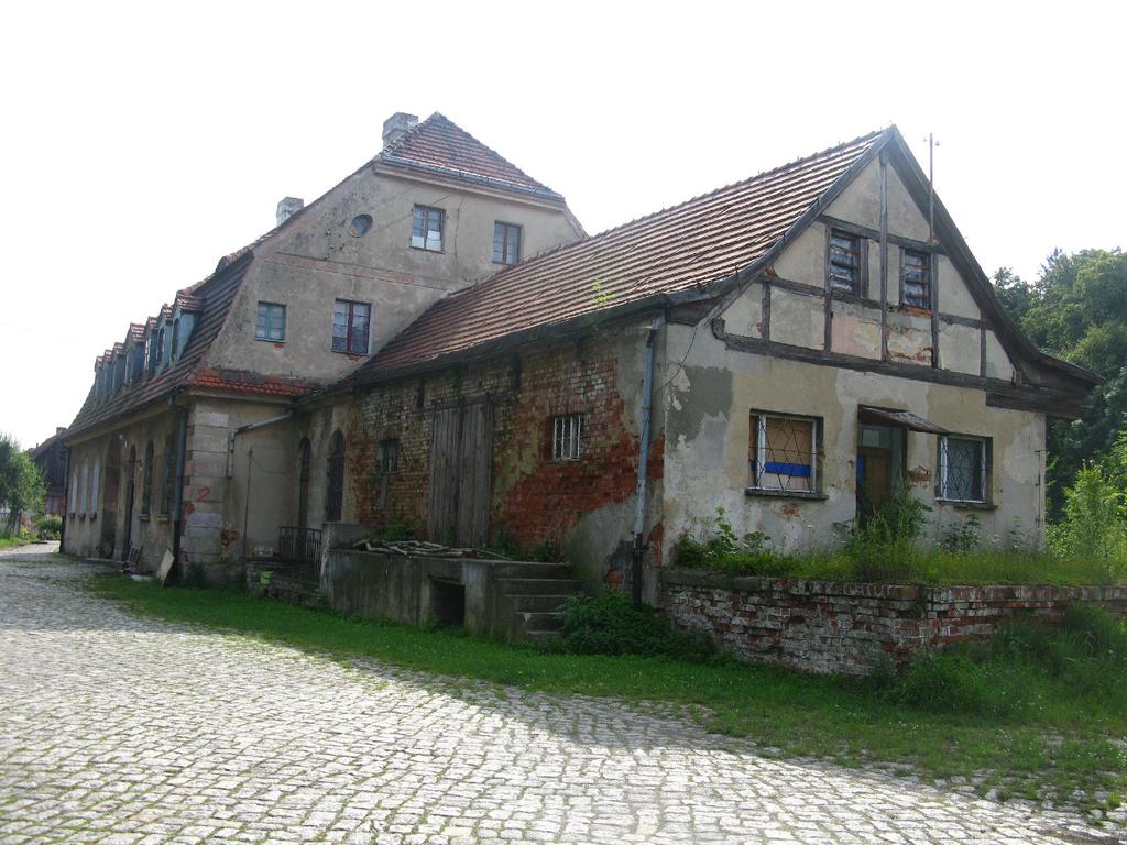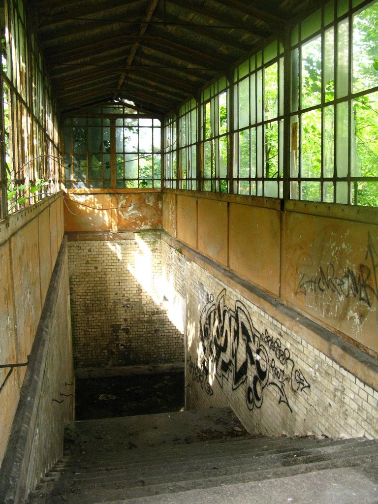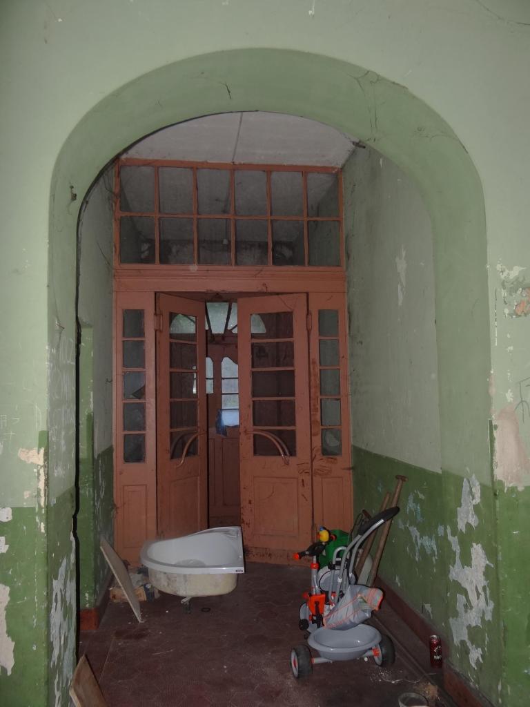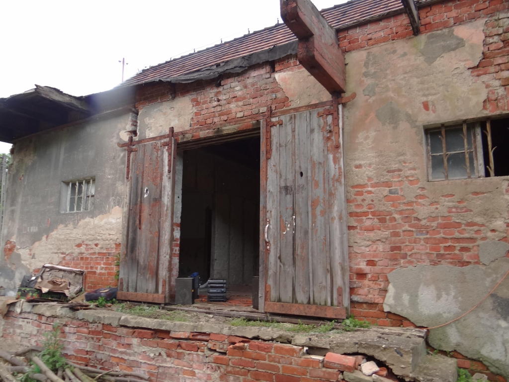 Rozpadający się magazyn towarowy przy budynku dworca (z lewej, poza kadrem). Widok od strony podjazdu.
