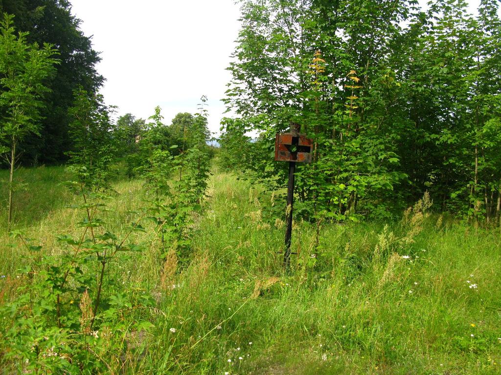Wskaźnik na peronie rdzewieje pośród coraz bujniejszej zieleni… Widok w kierunku zachodnim: Bolków/Marciszów.