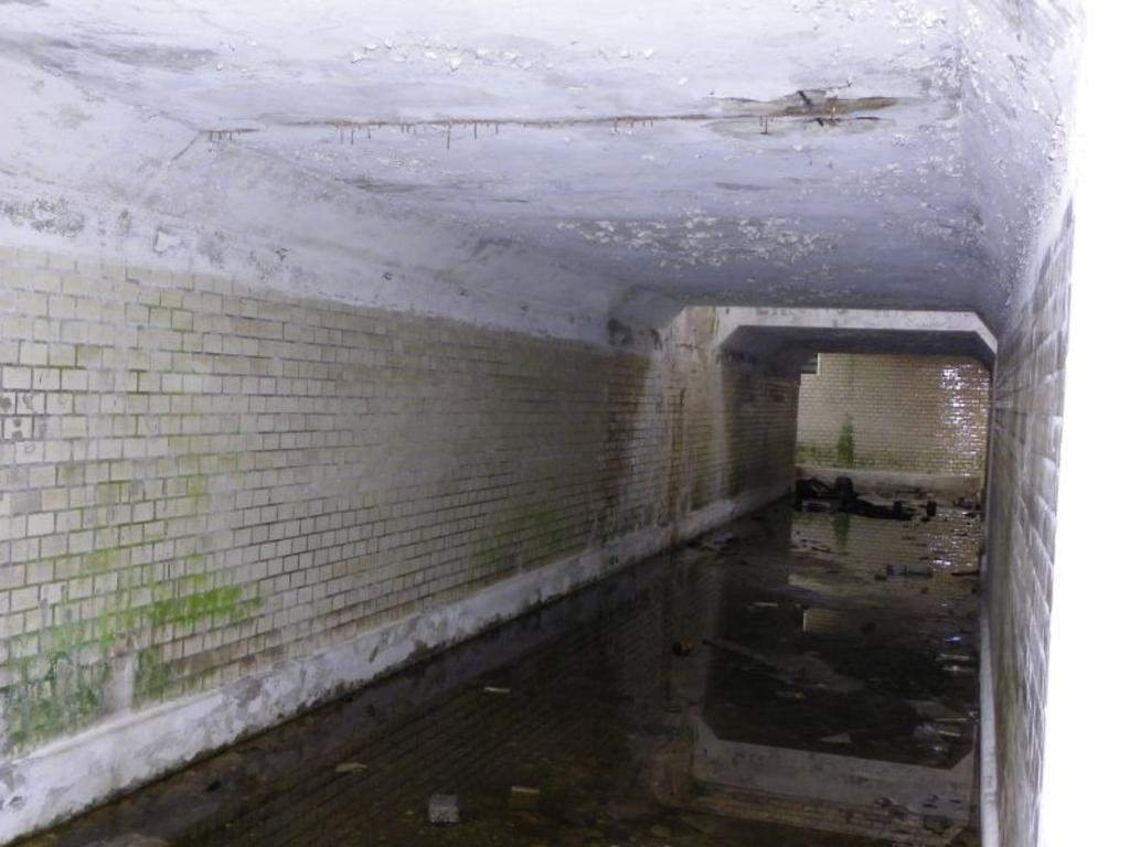 Wejście do przejścia podziemnego z peronu 2. Z prawej prześwituje przez zarośla budynek dworca. Widok w kierunku zachodnim: Bolków/Marciszów.