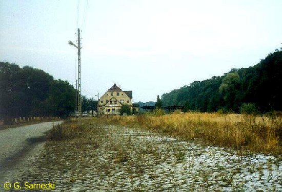 Z prawej nieczynna nastawnia. Z lewej jeden z kolejowych budynków mieszkalnych. Widok z placu przeładunkowego w kierunku południowym: w lewo dworzec i perony, w prawo Bolków/Marciszów.