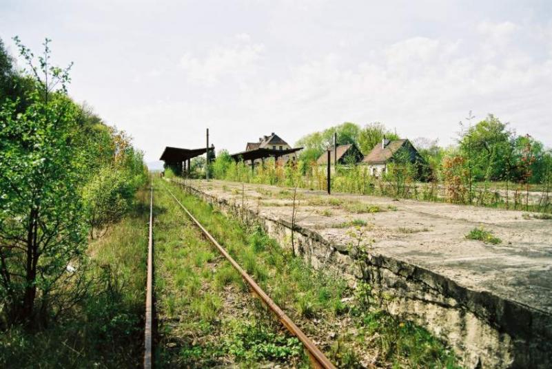 Pani siedzi już znużona oczekiwaniem i patrzy w stronę Strzegomia i Jawora. Nie wie, że od sześciu lat nikt nie wsiadł tu do pociągu. Widok w kierunku zachodnim.