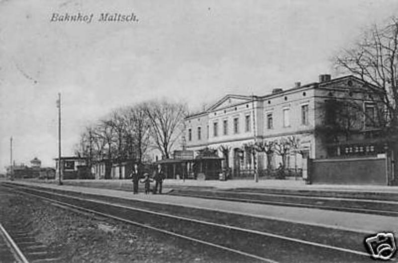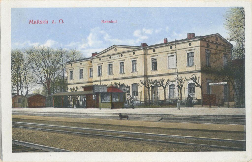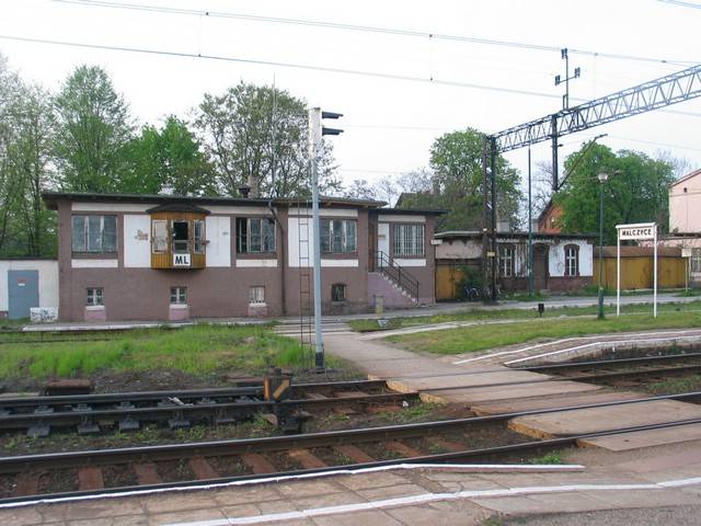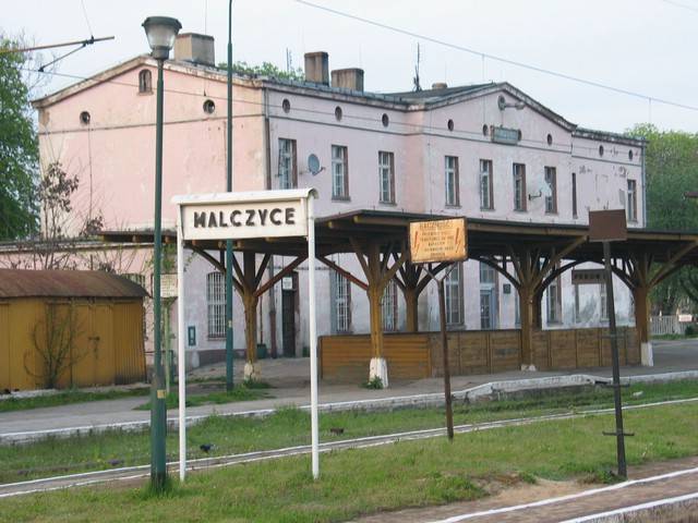 Stacja kolejowa w Malczycach. Widok na perony i budynek dworca w kierunku północno-zachodnim, od strony wjazdów z Wrocławia i Strzegomia.