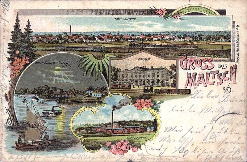 Stara litografia. Widok na budynek dworca i linię kolejową.