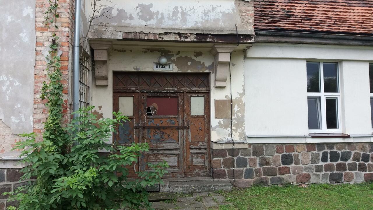 Drzwi wejściowe/wyjściowe z budynku dworca w Wapnie.