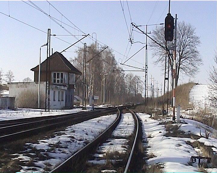 Semafory wyjazdowe. Widok w kierunku Strzelina/Wrocławia, po lewej nastawnia dysponująca Hr.