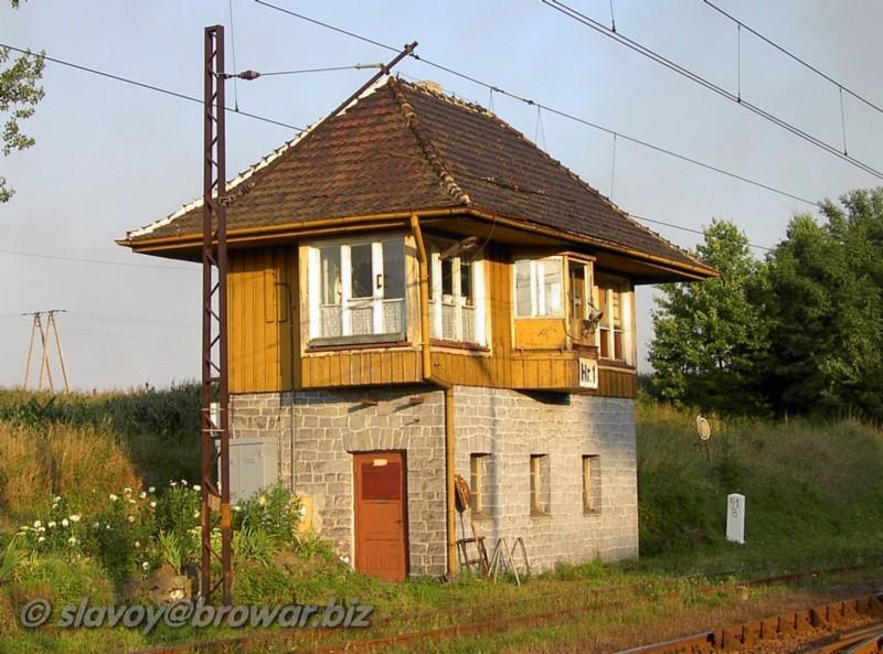 Nastawnia wykonawcza Hr1, stojąca na wyjeździe do Kamieńca Ząbkowickiego. Widok od strony peronów, w kierunku południowo-wschodnim.