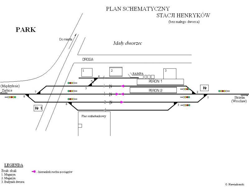 Plan schematyczny stacji Henryków, który wykonałem na podstawie własnych obserwacji. Może zawierać małe błędy lub niedociągnięcia.