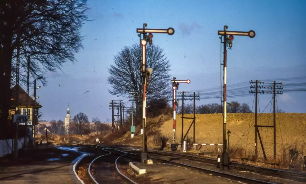 Zdjęcia dzięki uprzejmości Pana Wolfganga Schumachera. Henryków, widok na semafory wyjazdowe w kierunku Strzelina/Wrocławia. W tle nastawnia dysponująca Hr i kościół w Wadochowicach.