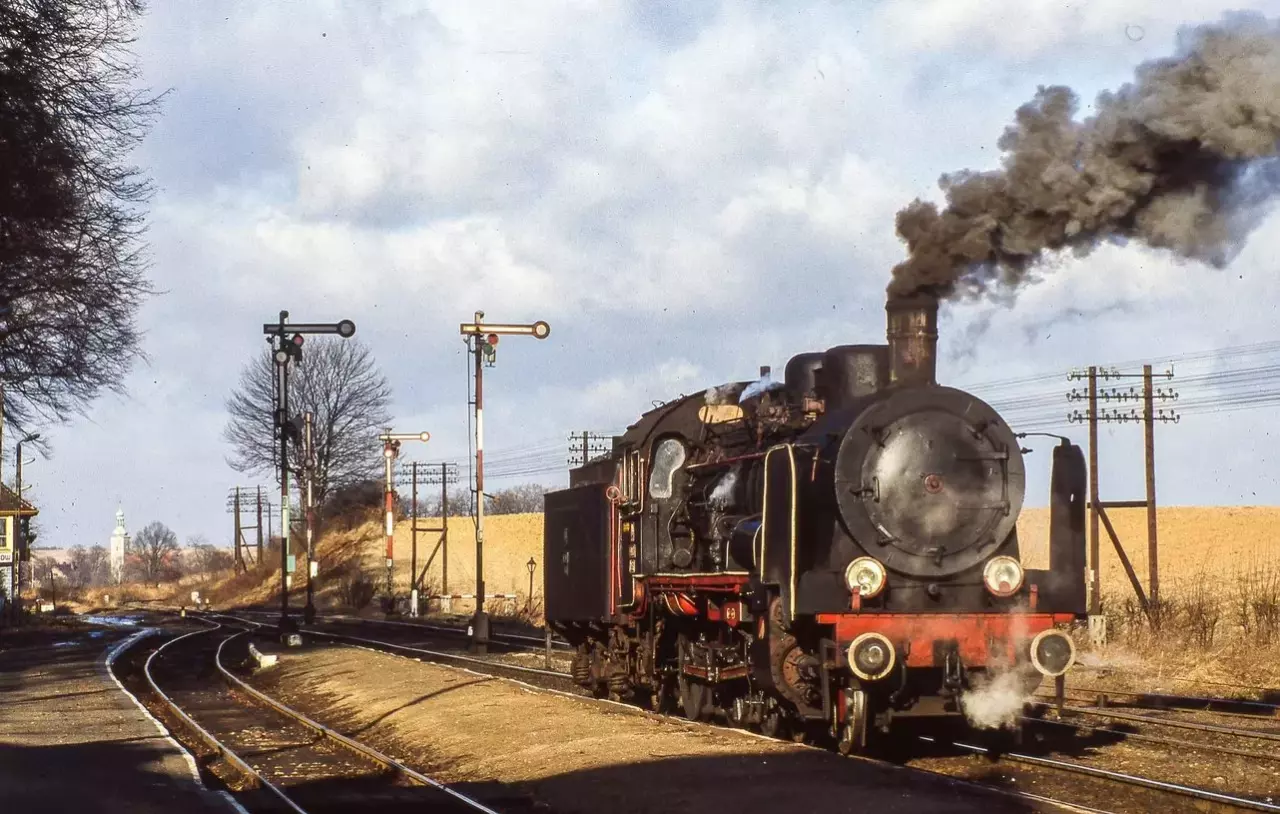 Zdjęcia dzięki uprzejmości Pana Wolfganga Schumachera. Fotografia wykonana z nieco innej perspektywy, ukazująca manewrujący skład z Ok1. Widok w kierunku północnym: Strzelin/Wrocław.
