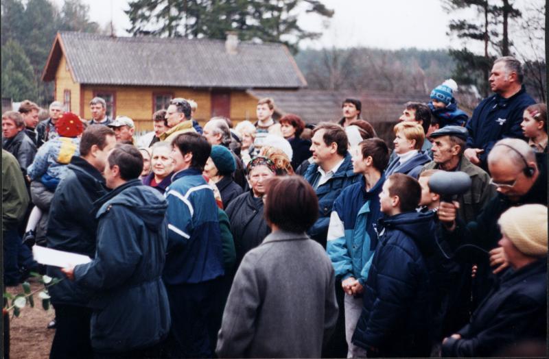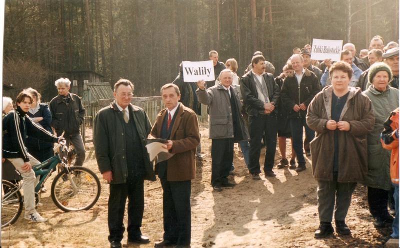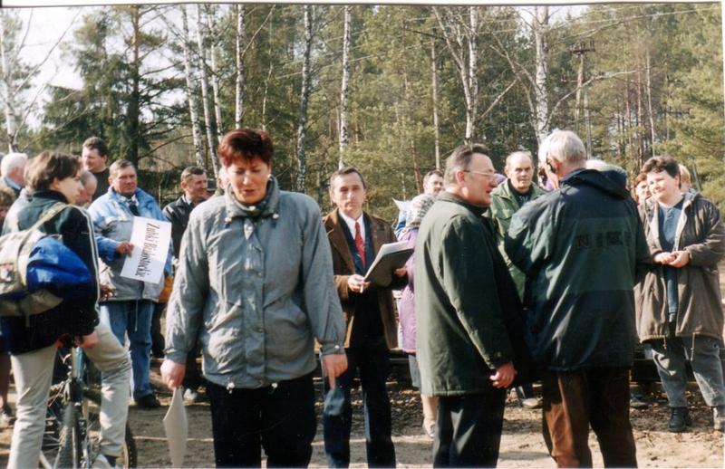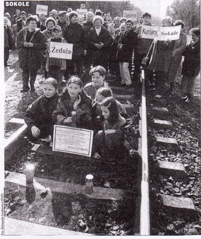 Happening na torach w Sokolem (01.04.2001 r.). Happening został zorganizowany w pierwszą rocznicę likwidacji przewozów PKP na linii Białystok - Zubki Białostockie. W happeningu udział wzięli mieszkańcy miejscowości, przez które przebiega szlak kolejowy: Kurian, Zajezierc, Żedni, Sokola, Walił, Straszewa i Zubek Białostockich. Na zdjęciu uczestnicy happeningu i Senator RP Sergiusz Plewa i radny gminy Michałowo Andrzej Kasperowicz.