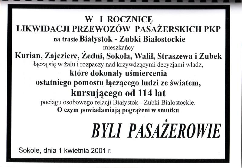 Happening na torach w Sokolem (01.04.2001 r.). Happening został zorganizowany w I - rocznicę likwidacji przewozów pasażerskich PKP na linii Białystok - Zubki Białostockie. Udział wzięli mieszkańcy miejscowości, przez które przebiega szlak kolejowy: Kurian, Zajezierc, Żedni, Sokola, Walił, Straszewa i Zubek Białostockich. W happeningu uczestniczyły media jak: prasa centralna i regionalna, Polskie Radio Białystok, TVP Białystok i PAP.
